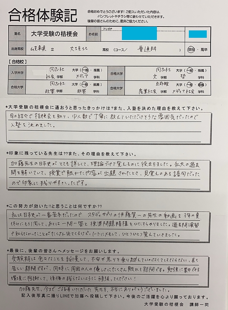 【合格体験記】TRさん 大垣北高校 高3【合格大学】・同志社大学 文学部 哲学科 合格・同志社大学 政策学部 政策学科 合格・同志社大学 社会学部 メディア学科 合格・立命館大学 文学部 言語コミュニケーション学科 合格・立命館大学 産業社会学部 メディア社会専攻 合格▼大学受験の桔梗会に通おうと思ったきっかけは?また、入塾を決めた理由を教えてください。母の紹介で桔梗会を知り、少人数で丁寧に教えていただけそうな雰囲気だったので入塾を決めました。▼印象に残っている先生は??また、その理由を教えてください。加藤先生の日本史がとても詳しくて、理論づけて覚えるのに役立ちました。私大の過去問を解いていて、授業で聞いた内容が出題されたとき、見覚えのある語句だったので印象に残りやすかったです。*この努力が効いた!と思うことは何ですか??私は日本史が一番苦手だったので、スタディサプリの伊藤賀一の先生の動画を3年の夏休みにもう1周して、あとは一問一答と標準問題精講をひたすらやりました。過去問演習で知らなきゃいけないことがたくさん出てくるけど、ノートにメモして、ひとつひとつ覚えていきました。*最後に、後輩の皆さんへメッセージをお願いします。受験期は色々なこと我慢して、不安や焦りを乗り越えていかなくてはならない、長く苦しい期間ですが、同時に周囲の人々の優しさにもたくさん触れる期間です。勉強に集中できる環境に感謝して、後悔の残らないように頑張ってください。加藤先生、今までご指導頂いた先生方、本当にありがとうございました!