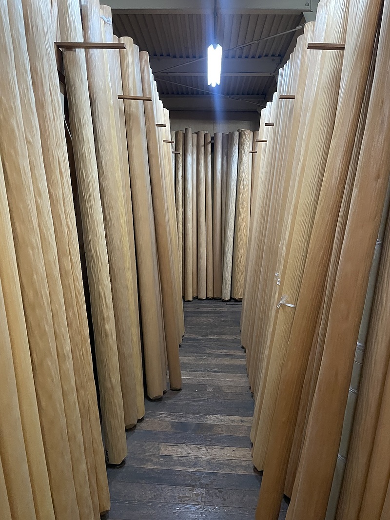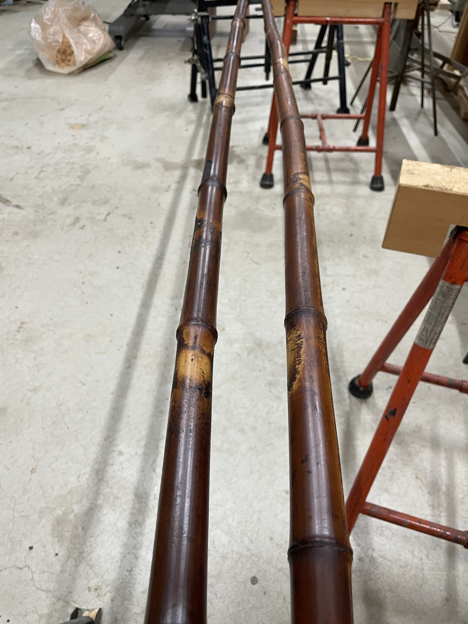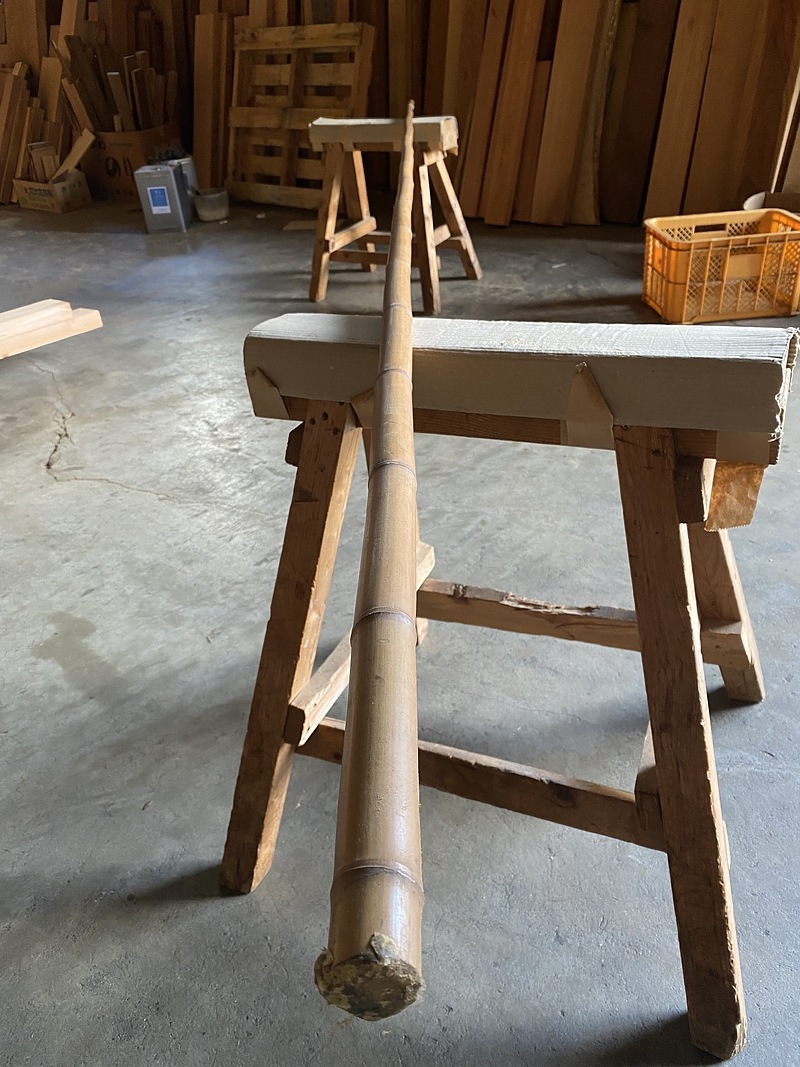 そんな時、とある銘木屋さんの倉庫の奥で、まるで宝探しのように材木の山をかき分け、埃を払いながら探していると…「これだ!」と直感が働きました。求めていた風合いの竹が、ひっそりと2本、見つかったのです。