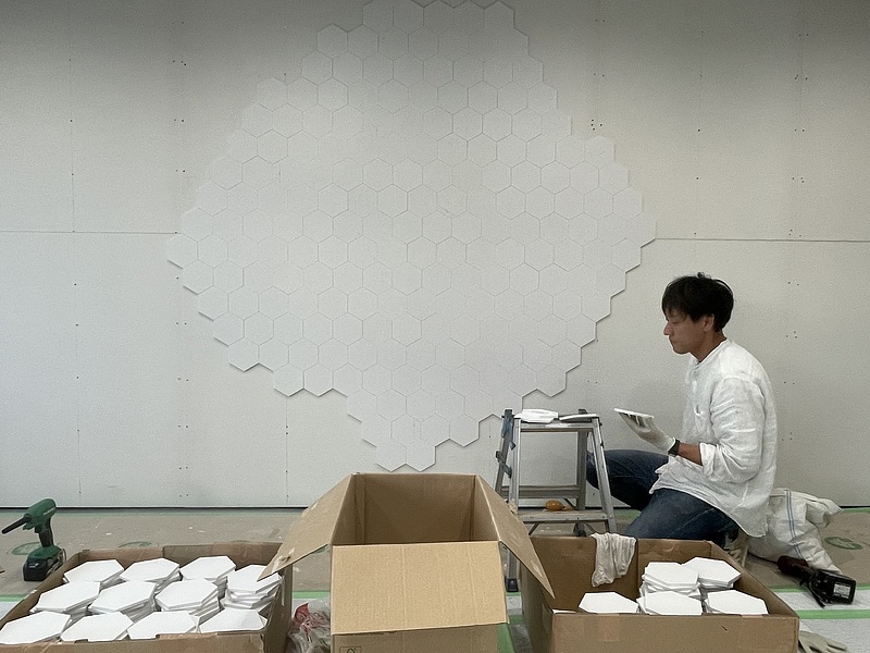 この作業が、大変なんですがめちゃくちゃ楽しいんです。六角形のピースを一枚一枚丁寧に貼り、大きな蜂の巣の模様を作り上げていく。まるで大きな作品を作っているかのような感覚でした。