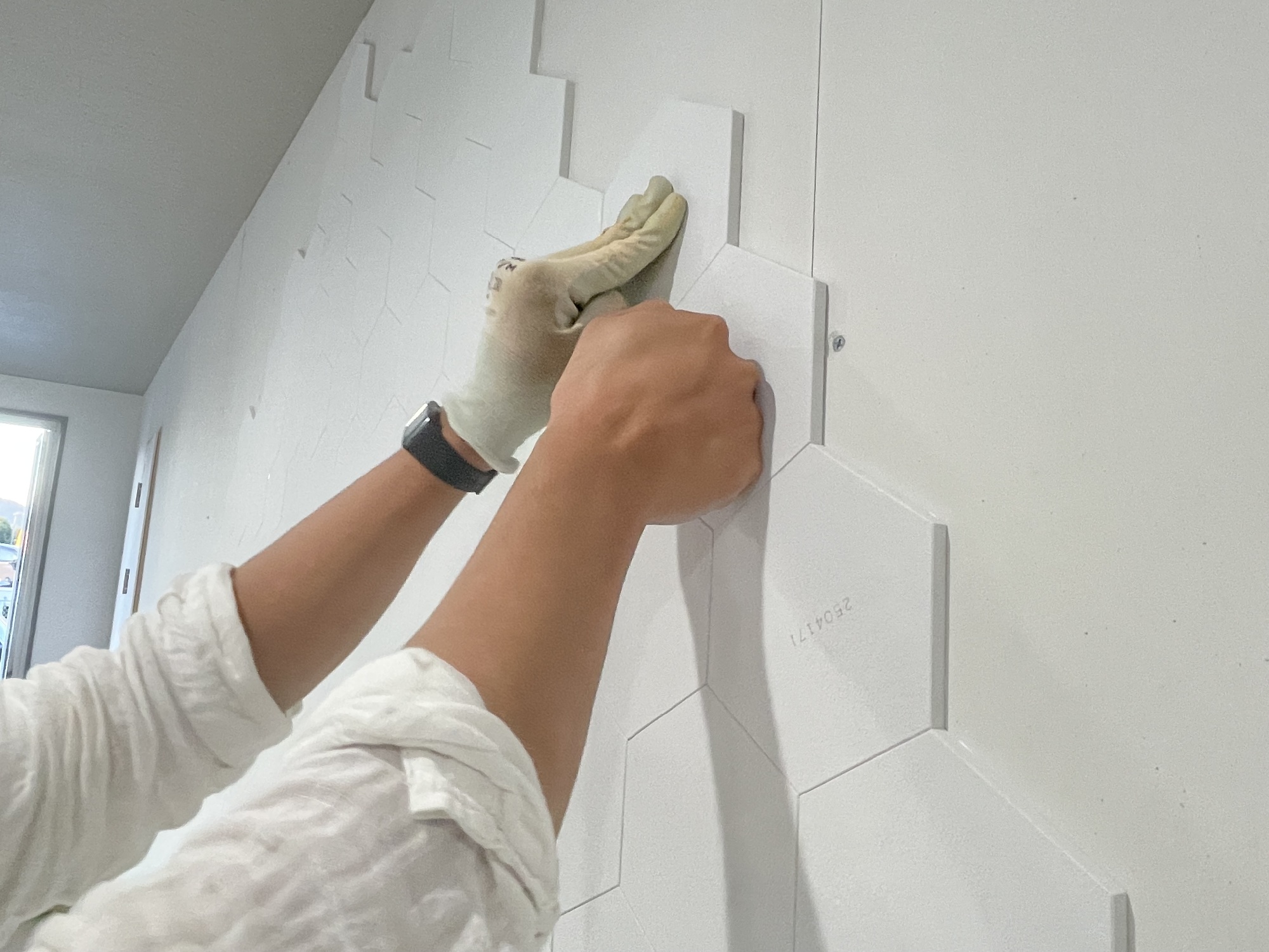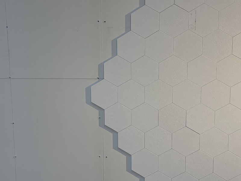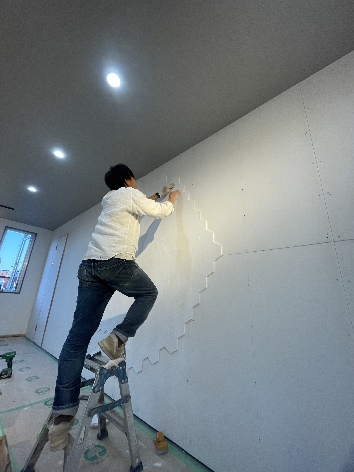 僕たちは、その要望を形にするために、NCという機械で六角形にくり抜いたケイカル板を壁一面に貼り付けていきました。