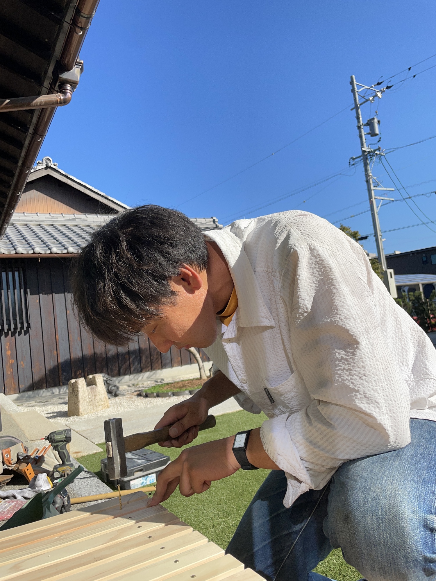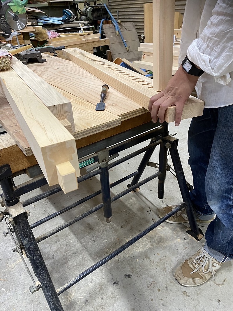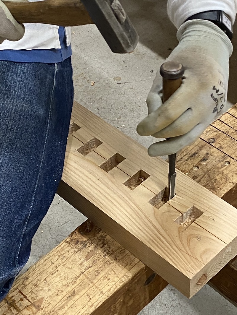 この濡れ縁は、木の柱に穴を掘る「ほぞ穴」や、そこに差し込む「ほぞ」、部材を組み合わせるための「切り欠き」といった、伝統的な加工をすべて手作業で行っています。