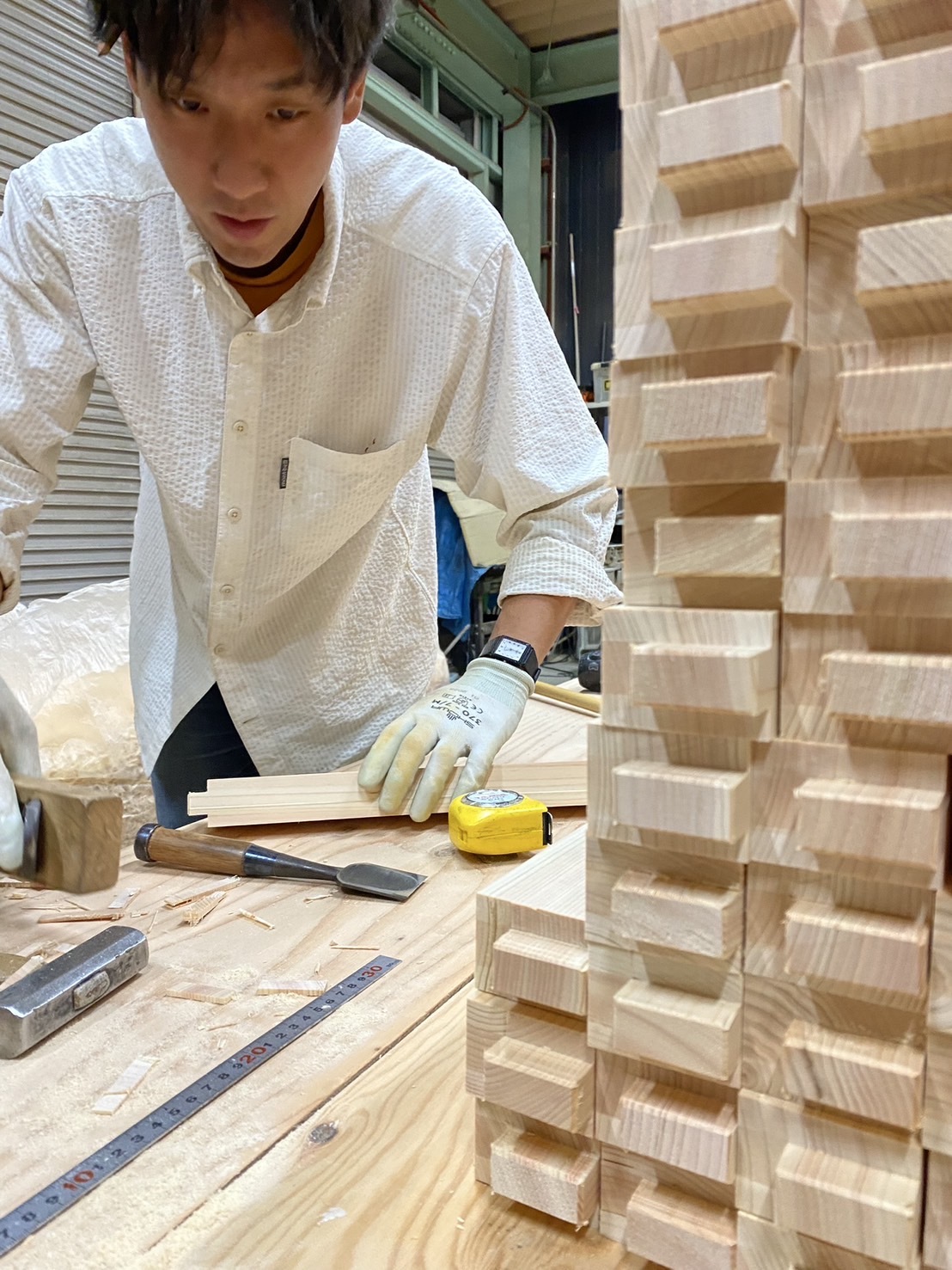 この手作業が、実は奥深いんです。一本ずつは寸法通りに加工できるのですが、これが全部の部材になると、手加工ゆえの微細な誤差が出てしまう。