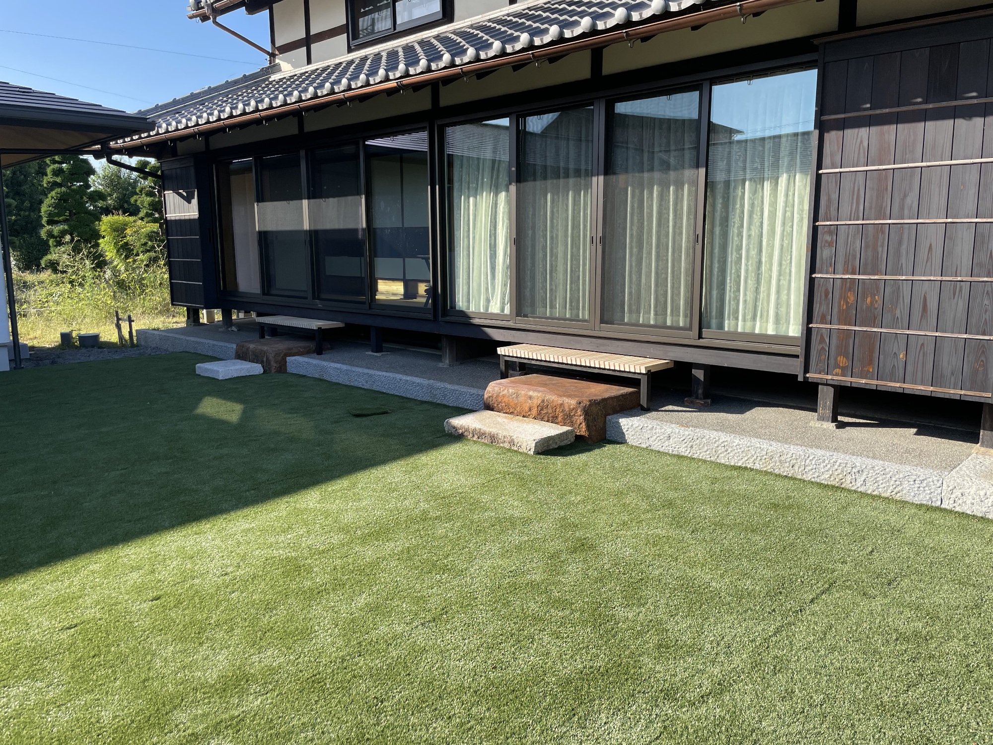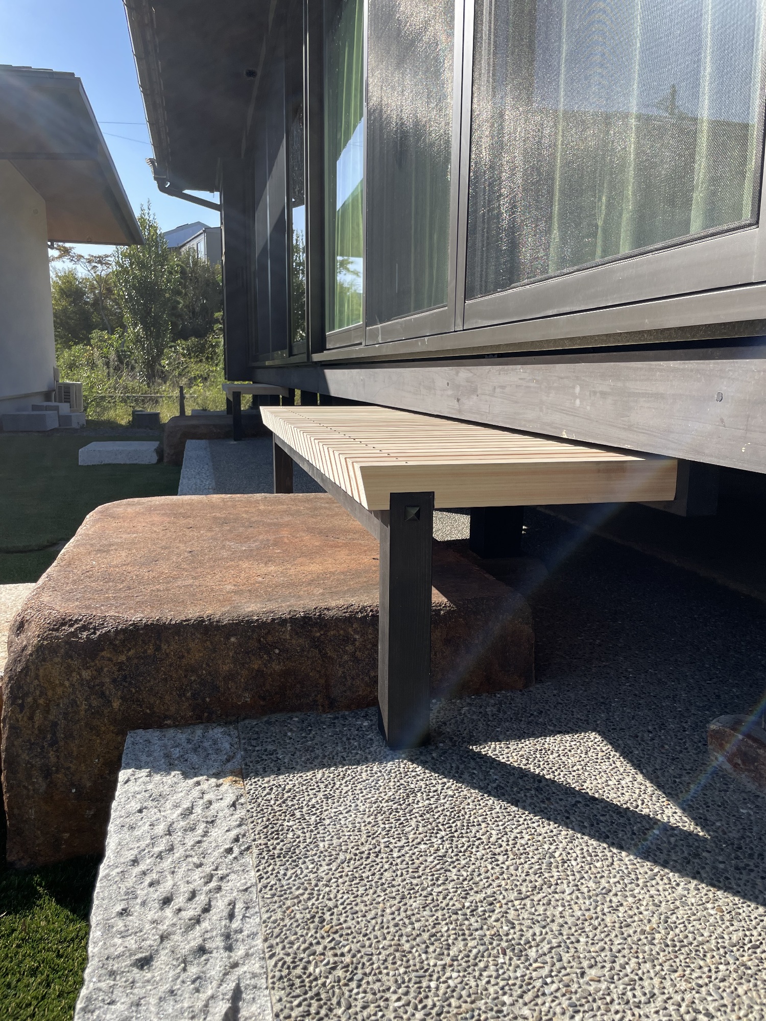 完成した濡れ縁は、家の黒い外壁と、どっしりとした靴脱ぎ石の間にスッと馴染み、とてもいい雰囲気になりました。