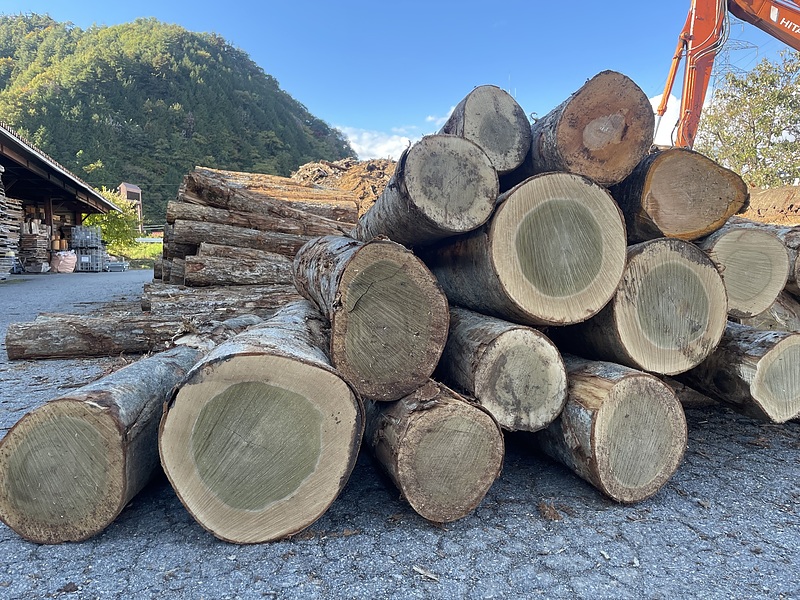ナラやブナ、ホオの木など、力強い木肌を持った広葉樹の丸太がたくさん並んでいました。