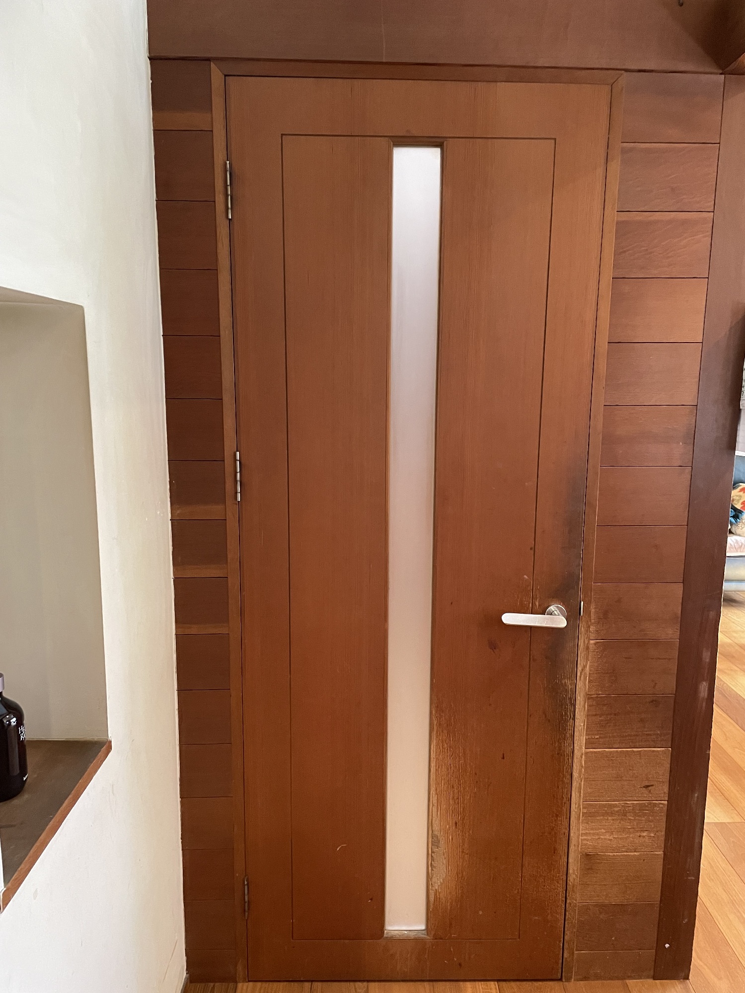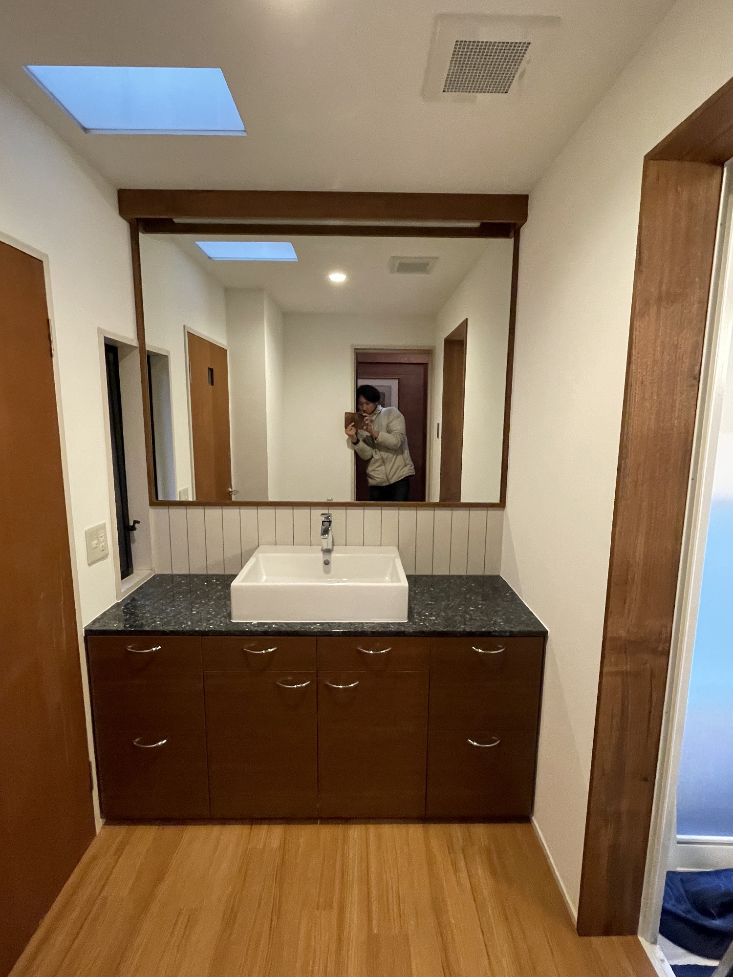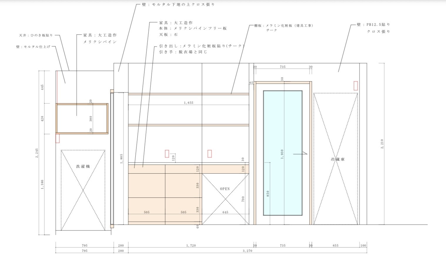 例えば、建具には既存のものと同じピーラーの突板を使い、家具は脱衣所の雰囲気に合わせてチークを選びました。