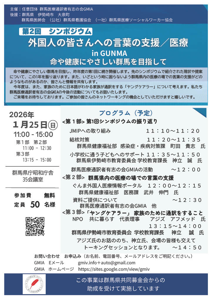2025年度のGMIAの活動のまとめや、昨年のシンポジウムを経てその後の群馬県内での医療通訳に関する活動や、今年の討論テーマとして「ヤングケアラー」を取り上げます。少しずつですが、医療通訳サービスに関する知識も広まりつつあり、今回のシンポジウムは前回よりも多くの行政や組織にご後援いただきました。大変感謝しております。それでもまだまだ認知度は低く、必要とされる方々に情報が届いていないと感じております。諦めずにコツコツと進んでいきたいと思っております。