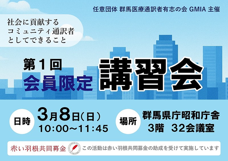 Hello! 今朝は晴れていましたが現在は曇りで寒い高崎です。昨日の日曜日は、任意団体 群馬医療通訳者有志の会の理事として、会員限定講習会を企画運営しました。第一部では精神科産業医の先生にストレスチェック制度についてご講演いただき、第二部では医療通訳者の交流の場として座談会を行いました。とても興味深く、医療通訳者にとっては有益な時間が持てたと思います。