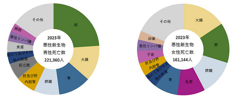 日本人の部位別がんの罹患率(2019年)の円グラフを見ると、男性は①前立腺がん、②大腸がん、③胃がん、④肺がんが多く、女性は①乳房がん、②大腸がん、③肺がん、④胃がんが多いことが分かります。