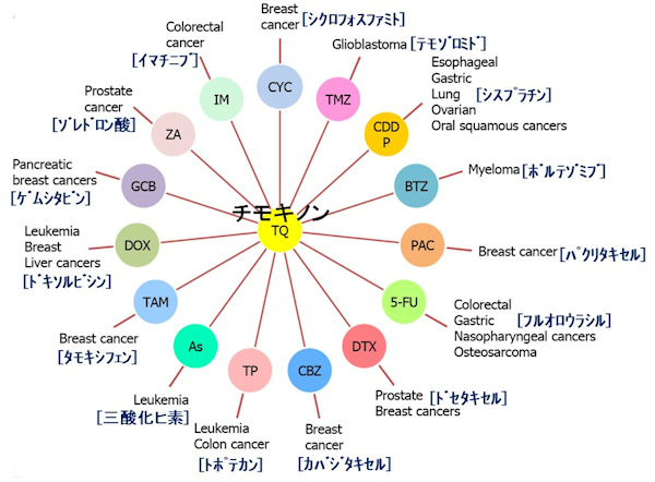 観覧車のような図は、たとえば乳がん(Breast cancer)に対するシクロフォスファミド(CYC)、パクリタキセル(PAC)、ドセタキセル(DTX)、カバジタキセル(CBZ)、タモキシフェン(TAM)、ドキソルビシン(DOX)、ゲムシタビン(GCB)処方時のように、様々ながんで用いられる抗がん剤や免疫抑制剤などの補助的食材としてチモキノン(TQ)が広範囲に役立つことを示しています。