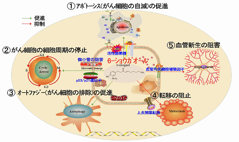 ショウガオールの抗がんメカニズムは、図に示すように、次の①~⑤のプロセスに関連しています。