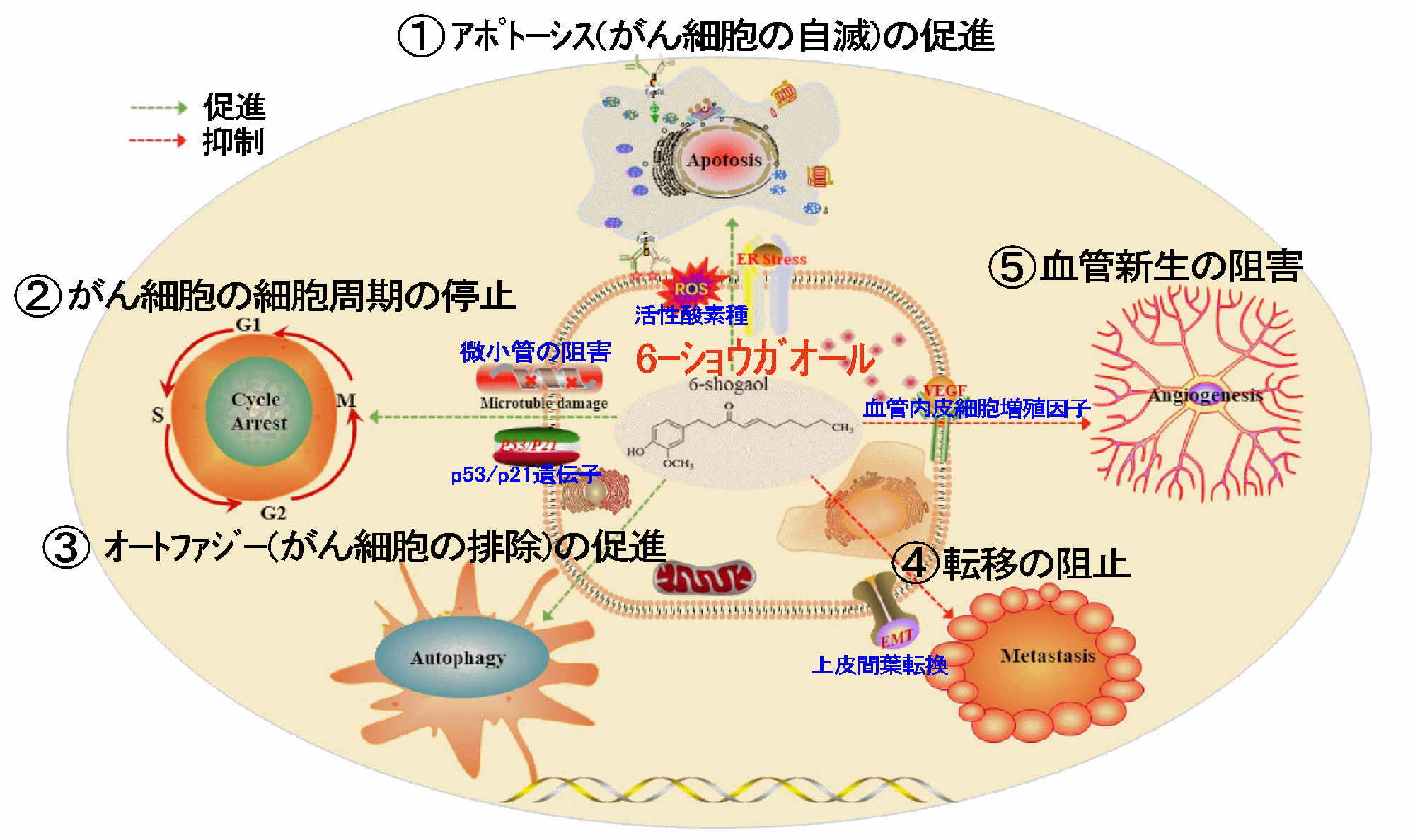ショウガオールの抗がんメカニズムは、図に示すように、次の①~⑤のプロセスに関連しています。