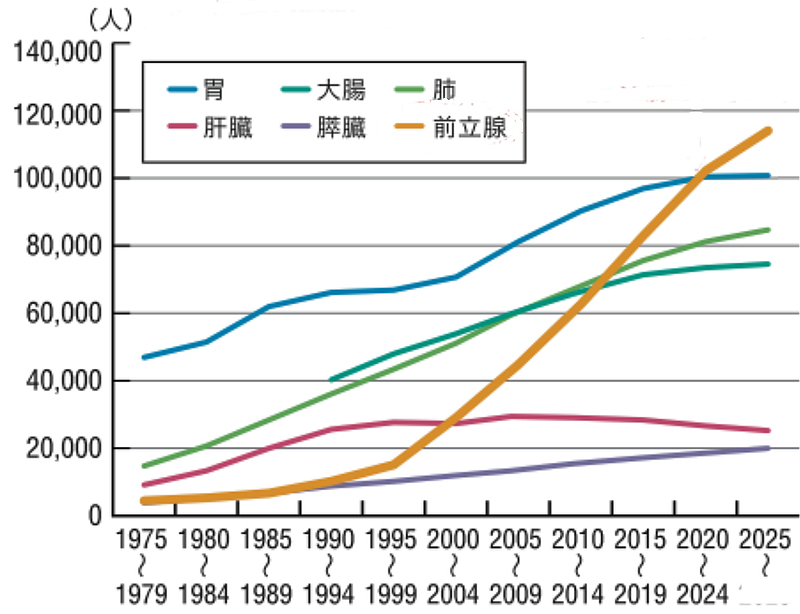 前立腺がんは日本人男性のがんの中で最も罹りやすいがんで、毎年約96,400人(2022年)が罹患し、約13,500人(2023年)が亡くなっています。