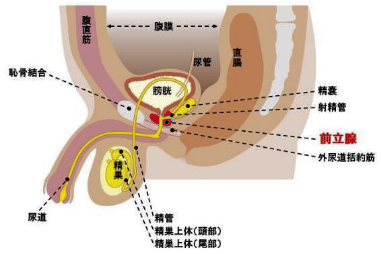 前立腺は図に示すように、男性の膀胱の下にあるクルミ大の臓器で、その発生から増殖・成長まで男性ホルモン(アンドロゲン)に依存しており、前立腺液を分泌して精子の保護などの役目を担っています。