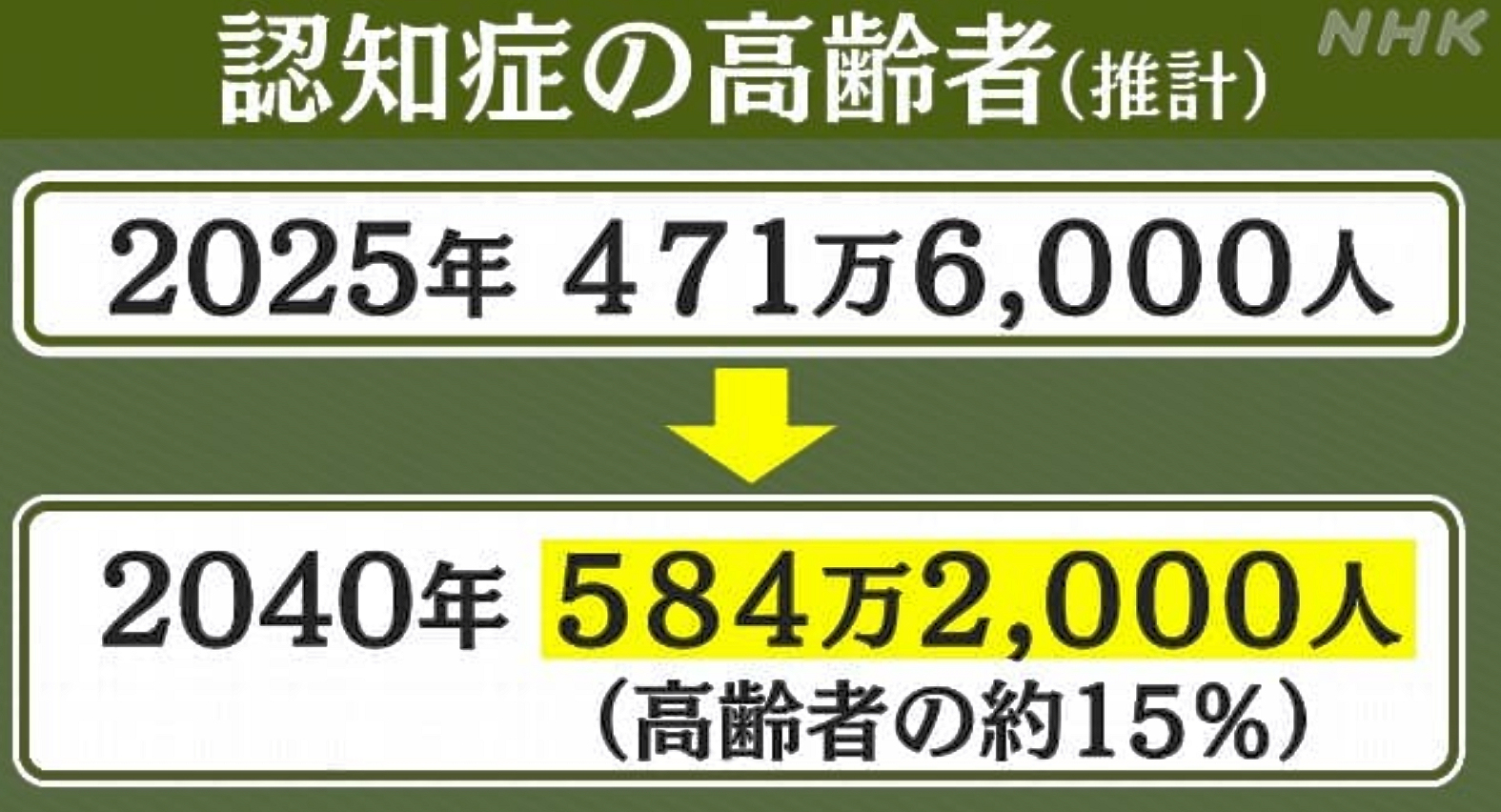 つまり、15年後の2040年には、高齢者のおよそ3人に1人が認知症か、軽度認知障害(MCI)を患うことになります。