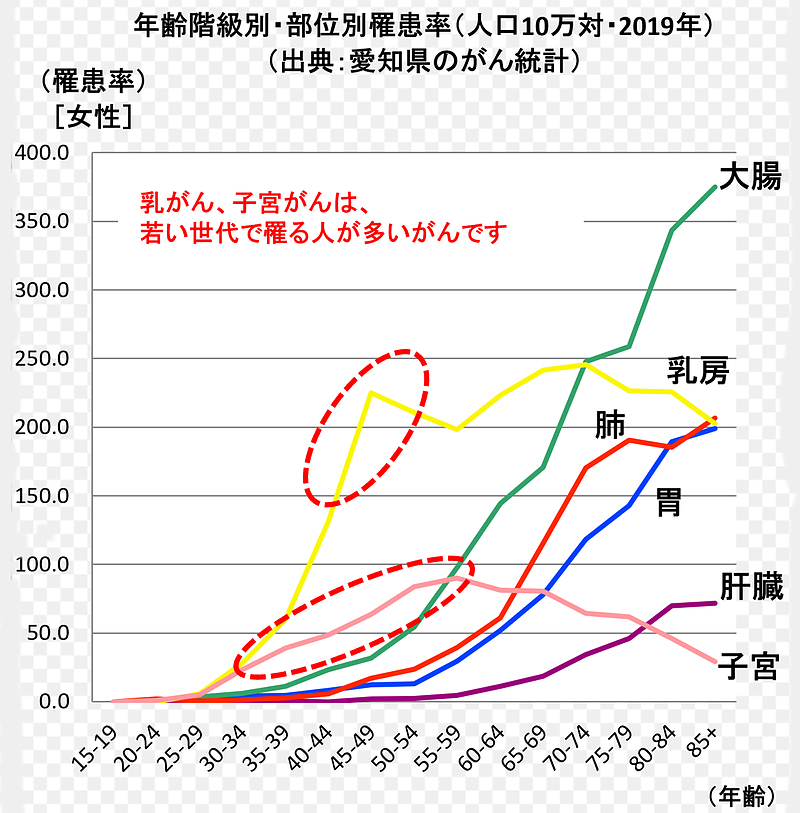 乳がんは女性で最も頻繁に診断されるがんであり、グラフに示すように、働き盛りで子育て世代でもある40代から急に罹患率が増加しはじめるという特徴があります。
