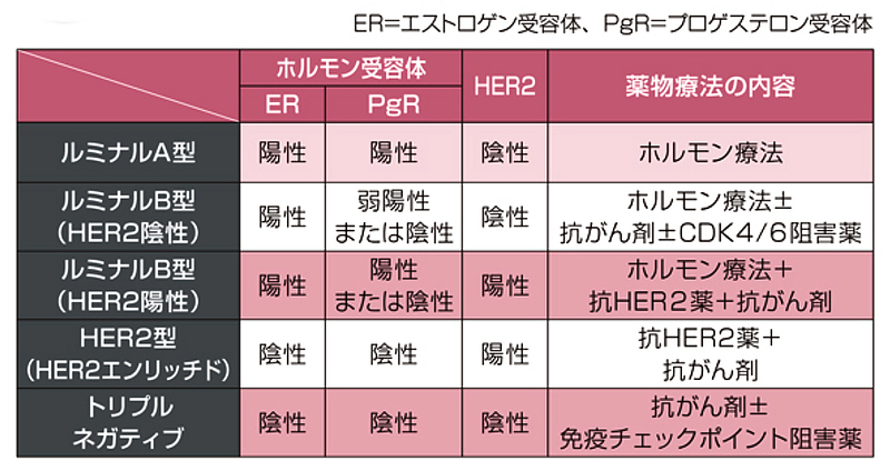 乳がんには、エストロゲン受容体(ER)またはプロゲステロン受容体(PgR)といったホルモン受容体の有無や成長促進タンパク質であるヒト上皮成長因子受容体2(HER2)のレベルの過剰など、腫瘍の分子プロファイルに従って、表に示すように、1)ルミナルA型、2)ルミナルB型(HER2陰性)、3)ルミナルB型(HER2陽性)、4)HER2型(エンリッチド)、5)トリプルネガティブの5つのサブタイプに分類されます。