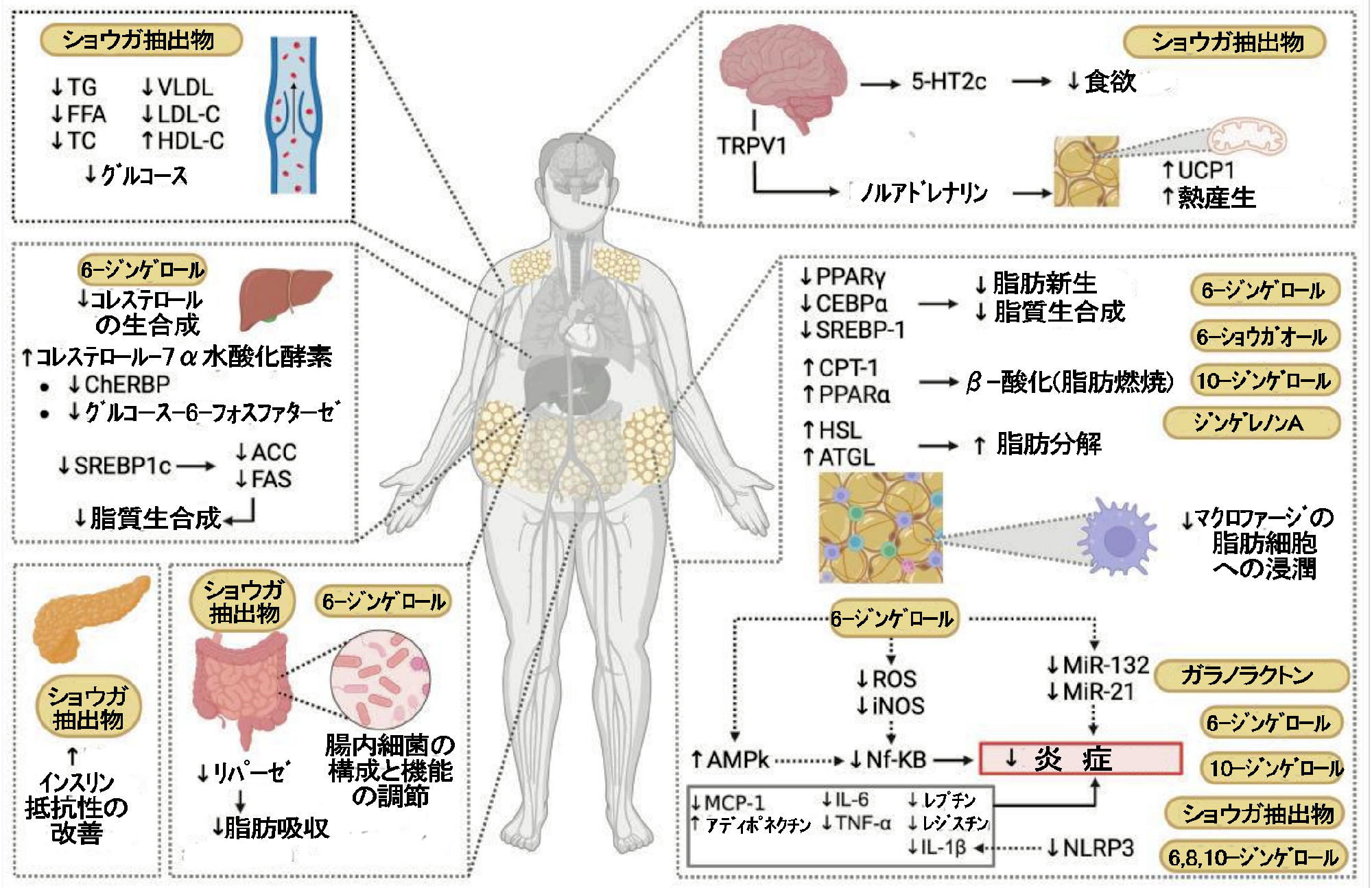そして、ショウガのジンゲロールやショウガオールは食欲や腸での脂肪吸収を抑えたり、脂肪細胞の新生や蓄積を抑制したり、炎症誘発性のサイトカインの活性を抑えて炎症を防いだり、アティポネクチンなどの抗炎症性アディポカインを増強させて、肥満をはじめ、脂質プロファイルや高血糖状態をも改善します。