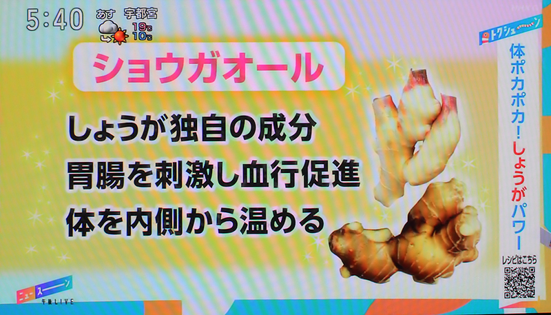2025年11月5日(水)の午後5時10分から、NHK総合テレビの「ニュースーン」という番組で、生姜特集が放送され、”ショウガオールにはカラダをポカポカ温める効果がある”という食品医学研究所の平柳要所長のコメントが紹介されました。