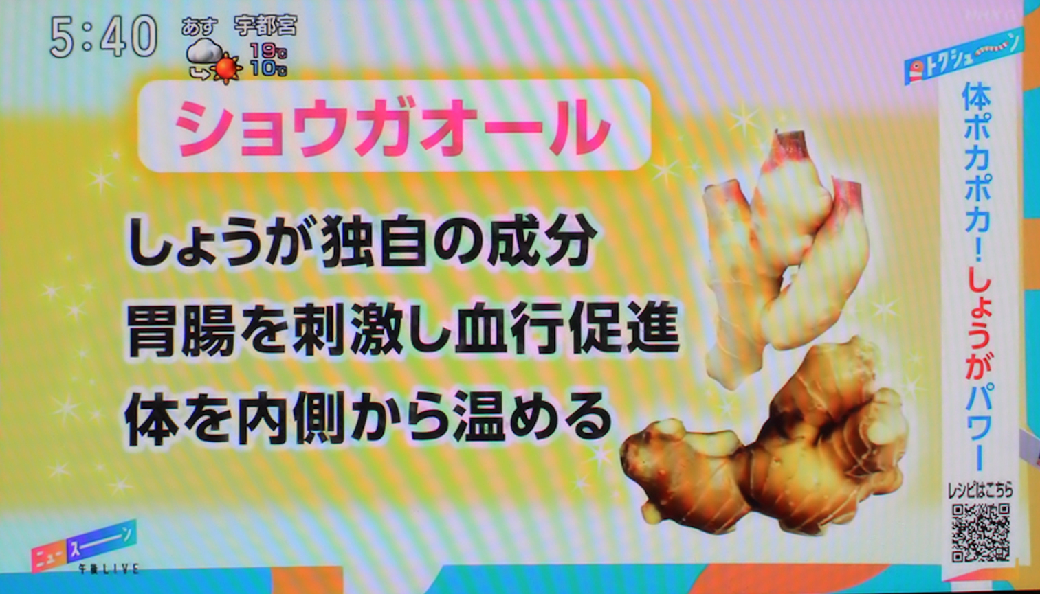 2025年11月5日(水)の午後5時10分から、NHK総合テレビの「ニュースーン」という番組で、生姜特集が放送され、”ショウガオールにはカラダをポカポカ温める効果がある”という食品医学研究所の平柳要所長のコメントが紹介されました。