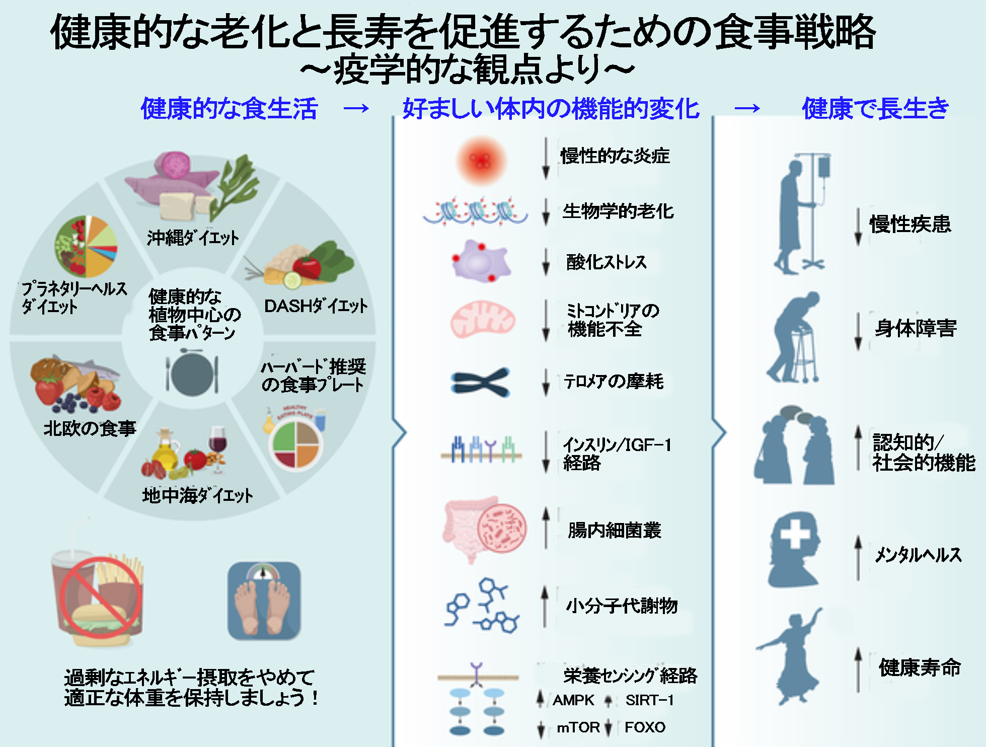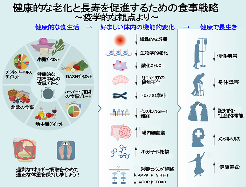 健康的な食生活は、図に示すように、身体諸機能に好ましい変化をもたらし、その結果として健康のままでの長生きをもたらたす可能性を示しています。