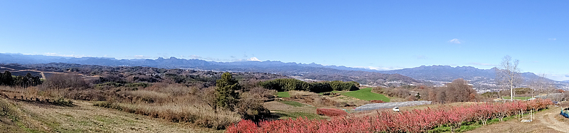 写真は食品医学研究所の近くの丘の上から、西方の妙義山や浅間山、北方の榛名山を写したパノラマで、手前の赤く染まった樹木はブルーベリーです。