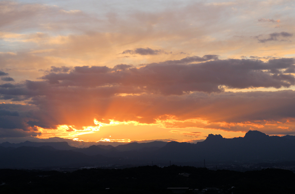 (写真はシルエットとして左に見える平べったい荒船山と右に見えるデコボコした奇岩の妙義山の間に沈む夕日の光景です)