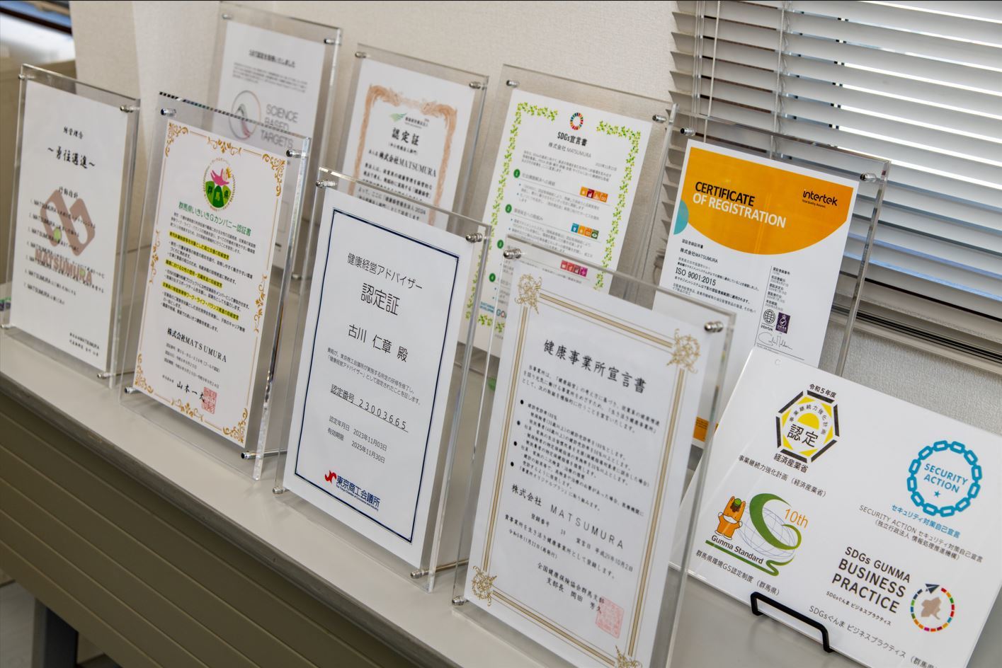 事業継続力強化計画、SECURITY ACTION(セキュリティ対策自己宣言)、パートナーシップ構築宣言、健康経営優良法人、健康経営アドバイザー、群馬県いきいきGカンパニー(ゴールド認証)、SBT(Science Based Target)、SDGsぐんまビジネスプラクティス