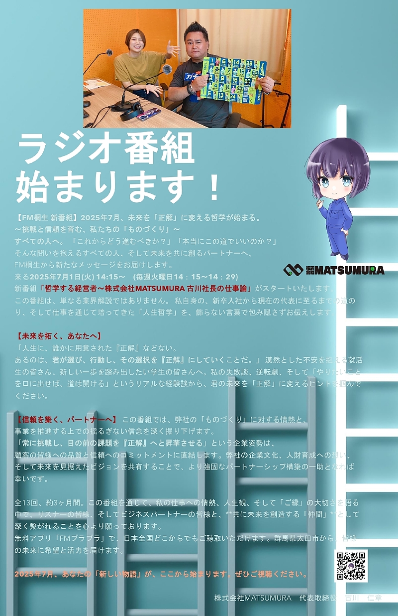 #FM桐生 #新番組 #古川社長の仕事論 #ものづくり #製造業 #哲学する経営者 #人生の選択 #キャリアデザイン #就活生と繋がりたい #ビジネスパートナー #株式会社MATSUMURA #ラジオのある暮らし #未来を創る