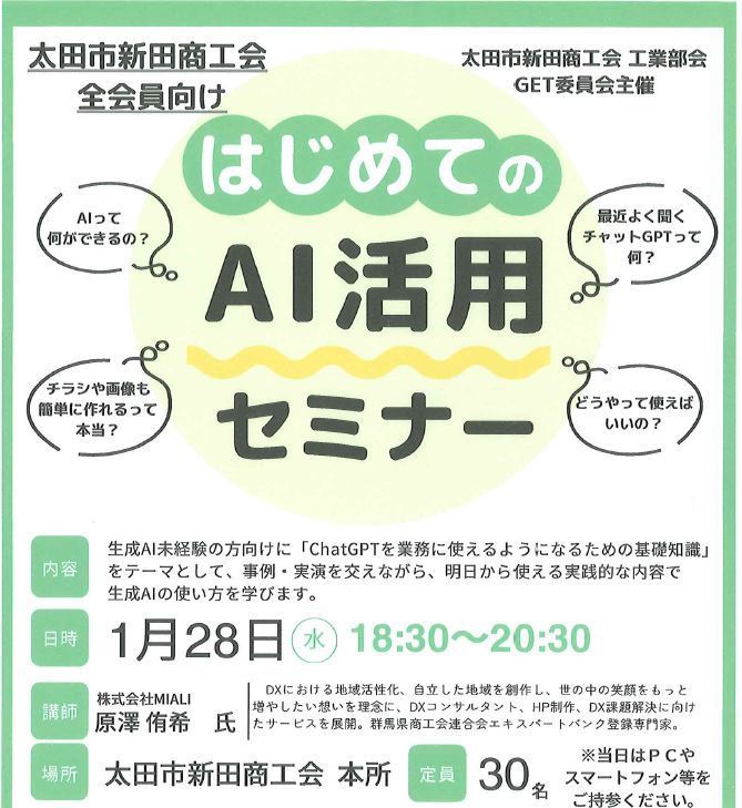 先日、地元の太田市新田商工会で開催された「はじめてのAI活用セミナー」に参加してきました 。