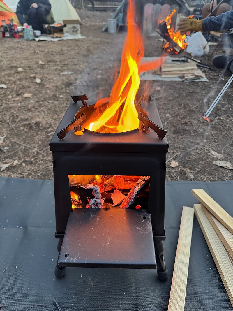 小型薪ストーブ: 煙が少なく、驚くほど暖かい。調理もこなす優れものです。