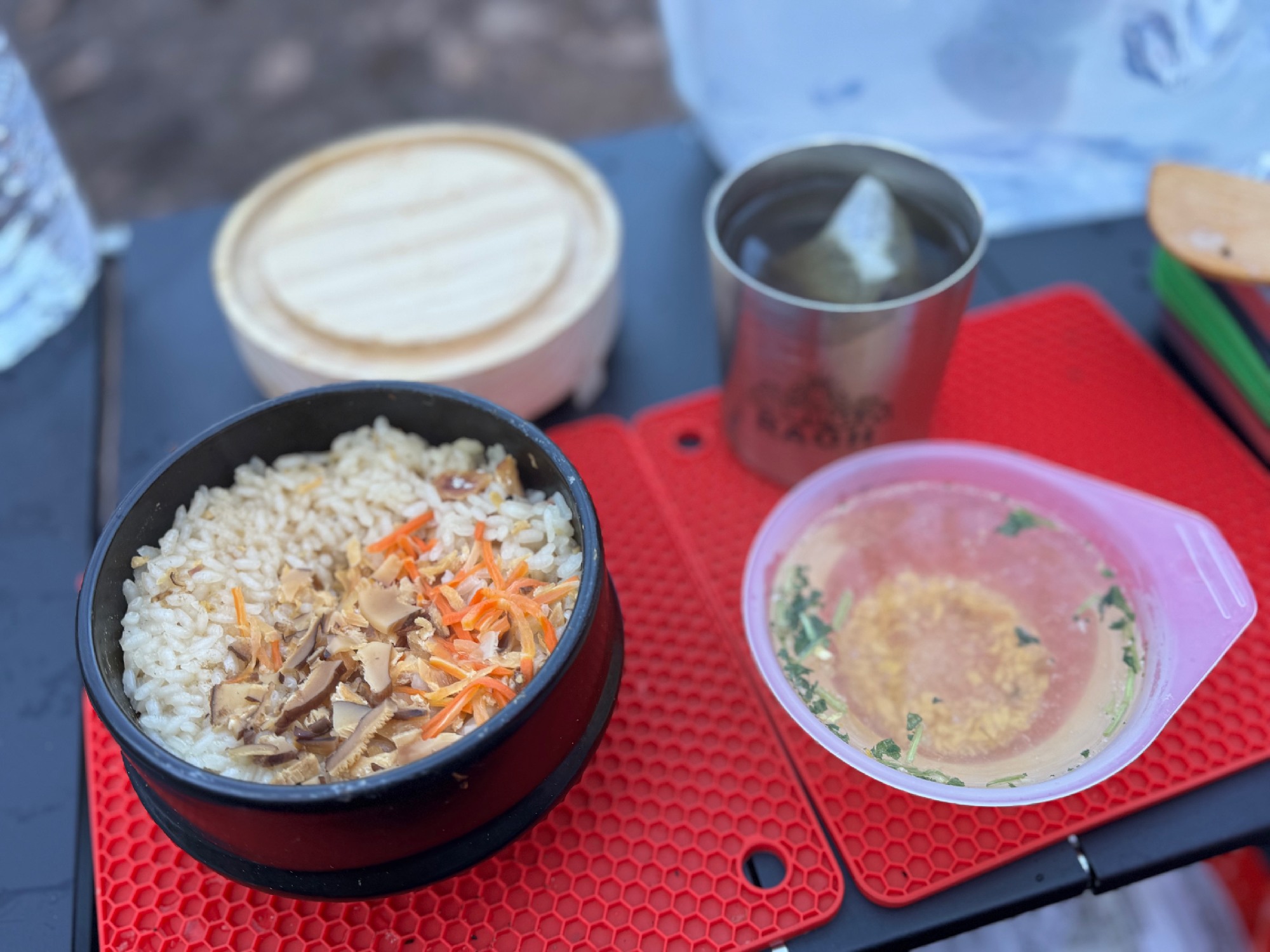 ミニかまど&羽釜土鍋: 朝晩、炊きたての炊き込みご飯に舌鼓を打ちました。