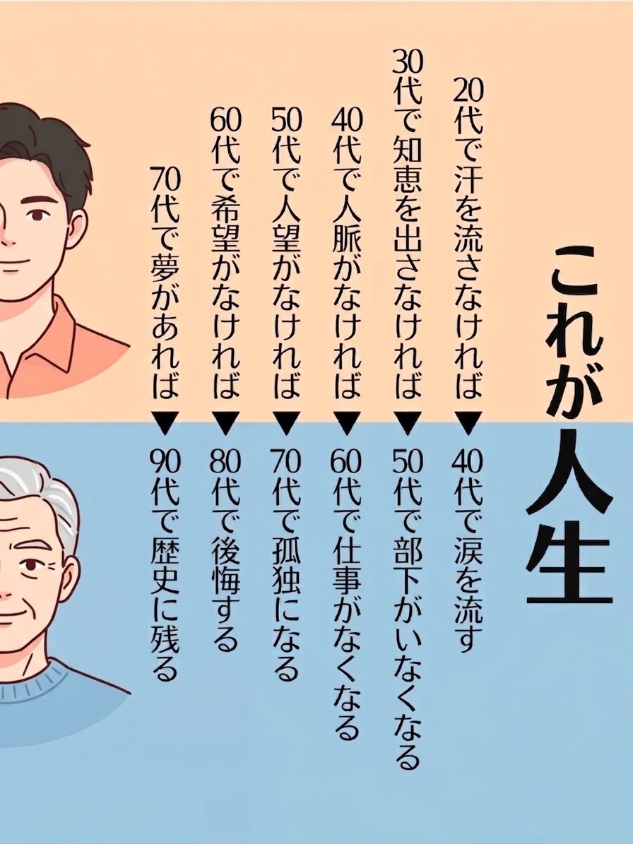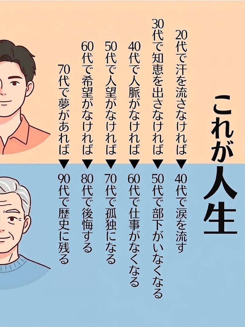 20代から90代まで、各年代で流すべき汗や知恵を怠ると、数十年後にどう自分に返ってくるかを説いた厳しい教えです。