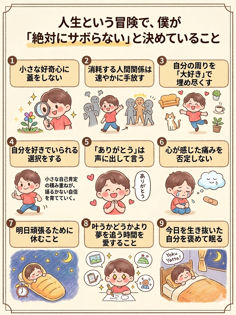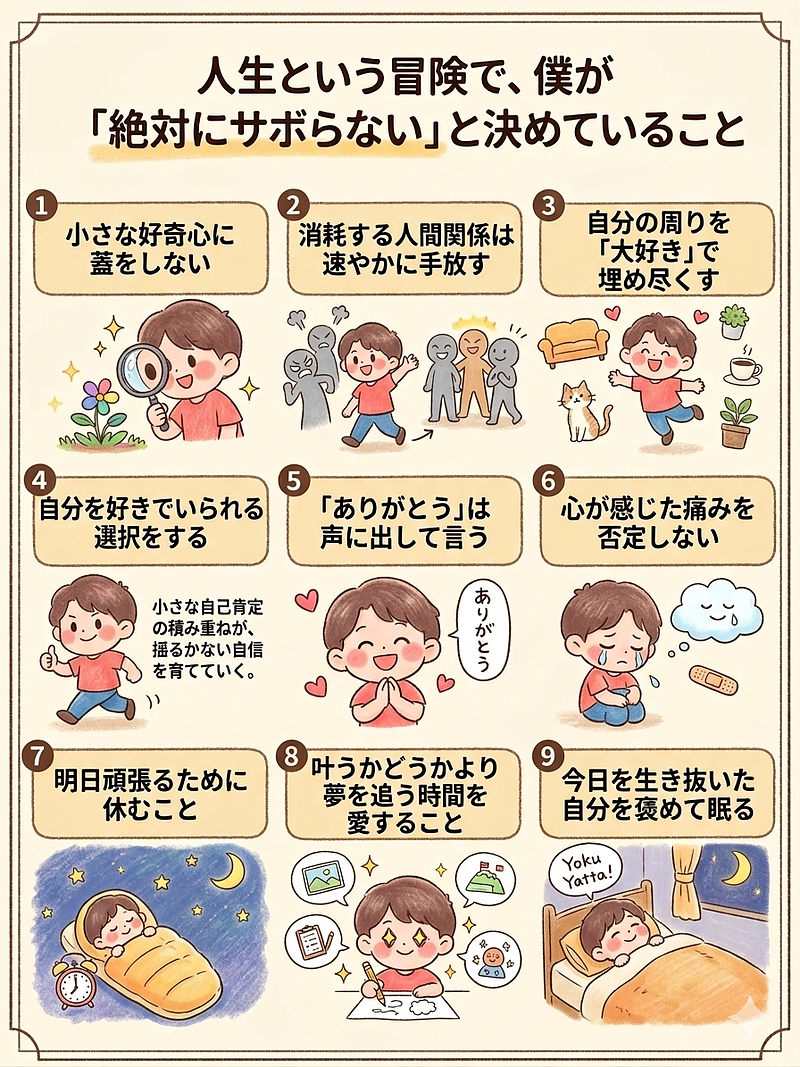 もし、皆さんが日々の中で少し疲れを感じているなら、まずは今夜、9番目の「自分を褒めること」から始めてみてください。