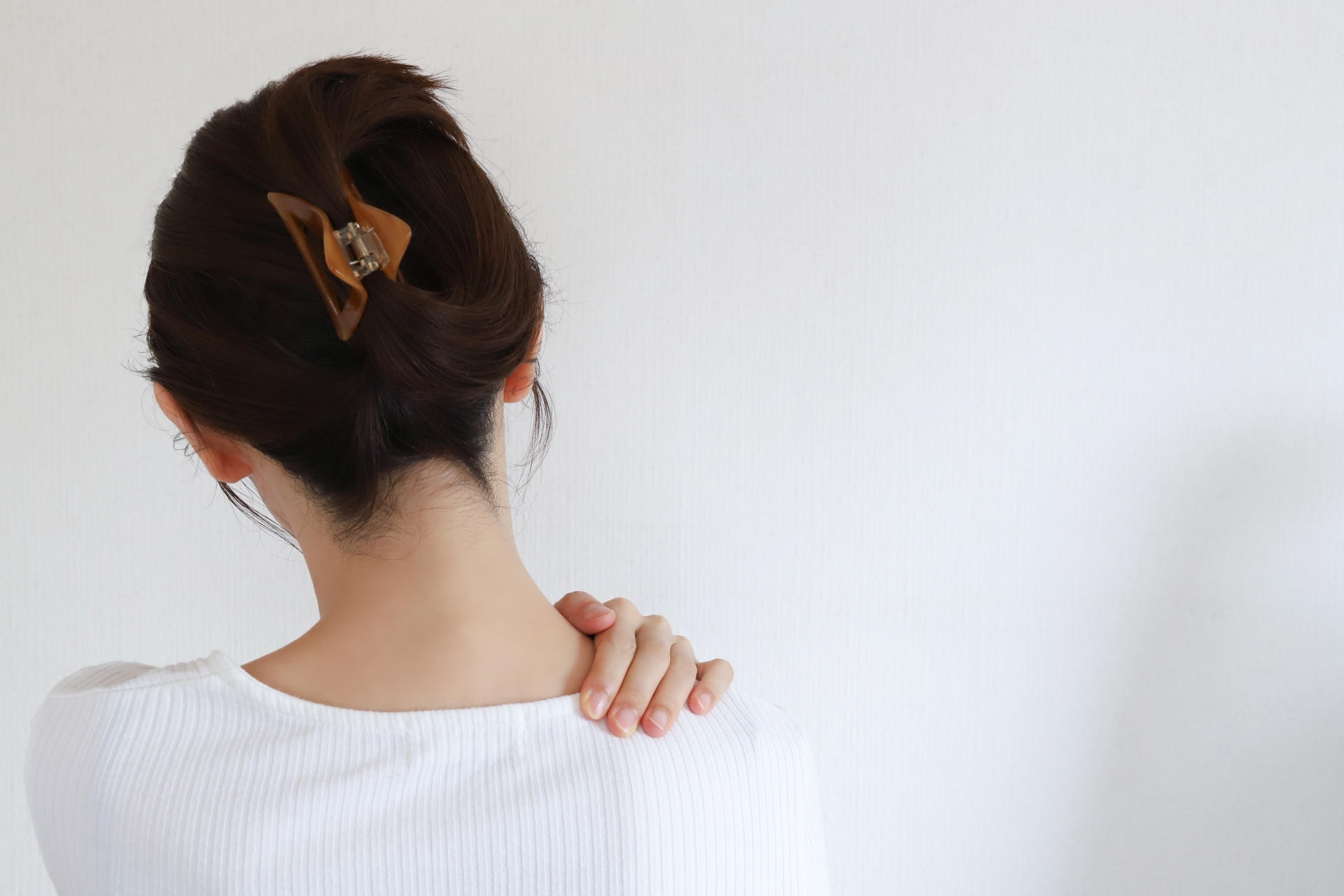 猫背になると、どうしても頭が前へ出てしまうことが多く、結果的に後ろ側の筋肉が張って硬くなってしまい、肩こりや肩甲骨周りの不調へ繋がってしまいます。