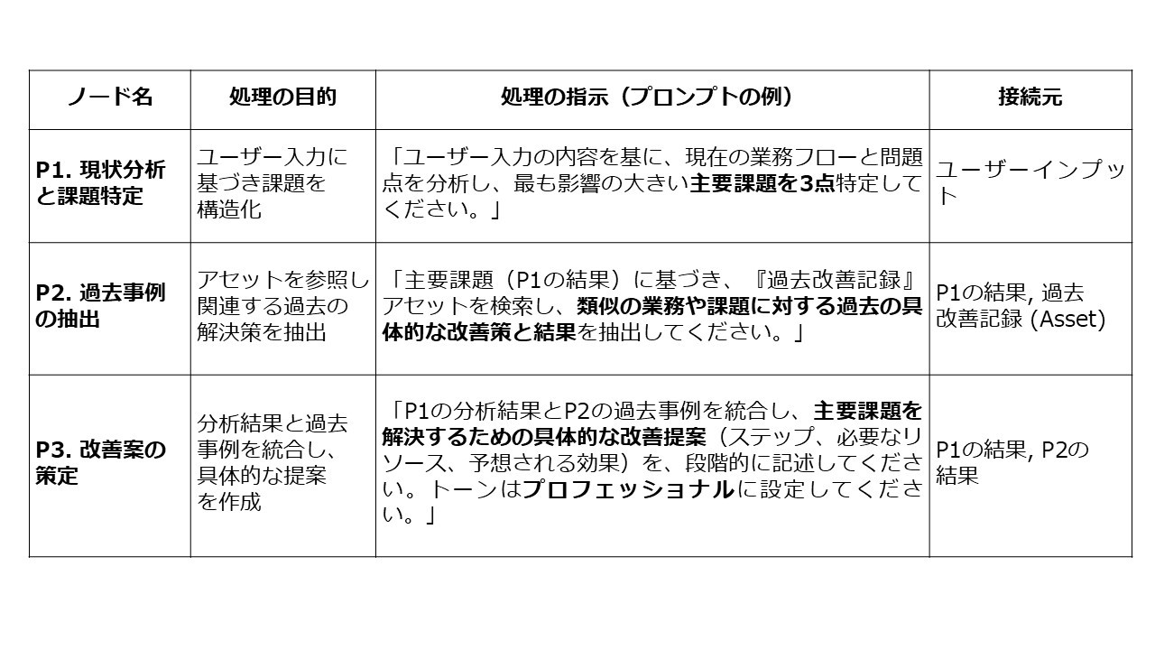 今回の「過去の改善記録を参照する」という複雑でカスタム性の高い業務フローを構築する場合、AIが自動でフローを組むチャットベースの方法よりも、手動でワークフローを構築し、アセットの参照やノード(ステップ)の指示を日本語で記述する方法が、期待通りの結果を得る上で遥かに効果的です。