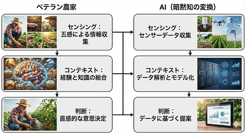 「今日は葉の色が薄いから、水を控えよう」。 こうしたベテランの判断は、長年の経験に基づく「暗黙知」であり、言葉やマニュアルにするのが非常に難しいものです。この「暗黙知」を、デジタル技術を使ってデータという「形式知」に変換し、次の世代へつないでいくこと。これが農業DXの核心的価値です。