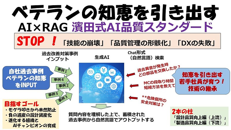 濱田式AI品質スタンダードは、下流(製造現場でのSDCAや異常察知)と、上流(生成AI×RAG×DRBFMによる設計段階でのリスク狩り)の2本の柱を同時に回すことで、真の品質保証体制を実現します。