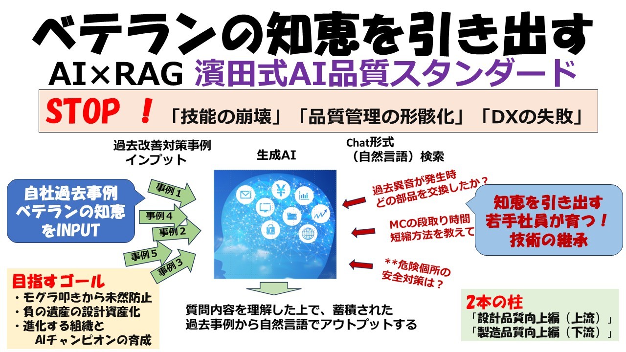濱田式AI品質スタンダードは、下流(製造現場でのSDCAや異常察知)と、上流(生成AI×RAG×DRBFMによる設計段階でのリスク狩り)の2本の柱を同時に回すことで、真の品質保証体制を実現します。