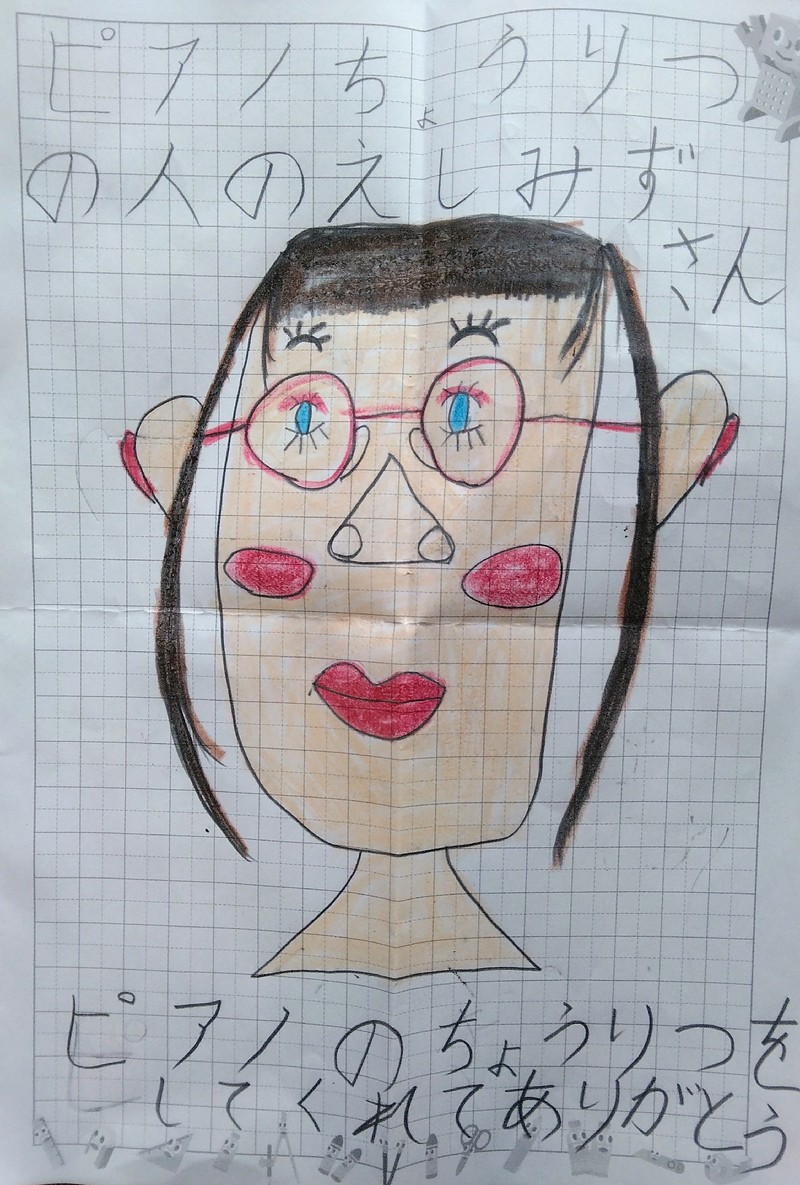 ピアノちょうりつの人のえしみずさんピアノのちょうりつをしてくてれてありがとう========================================≪しみずぴあの工房 回答≫お子様が、調律作業している後ろで、ずーっと何かを描いていて、まさか私の絵だとは...ビックリ!絵を貰った時は、とてもうれしかったです。ありがとうございます ♪