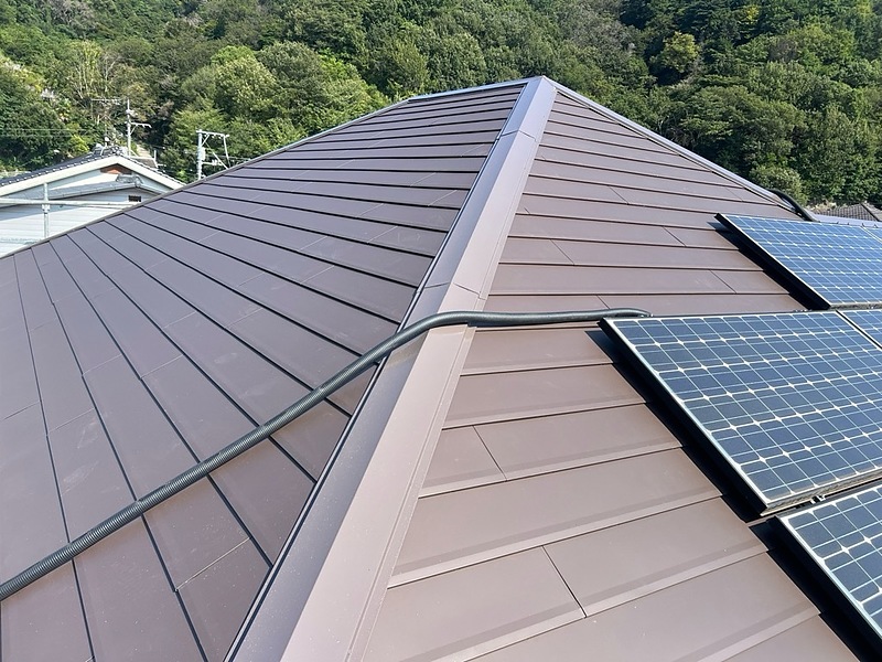 屋根には高耐久の金属屋根材「リコロニー」を、外壁には日本ペイント「パーフェクトトップ」を使用。