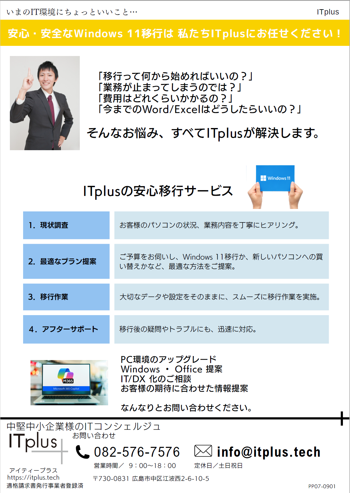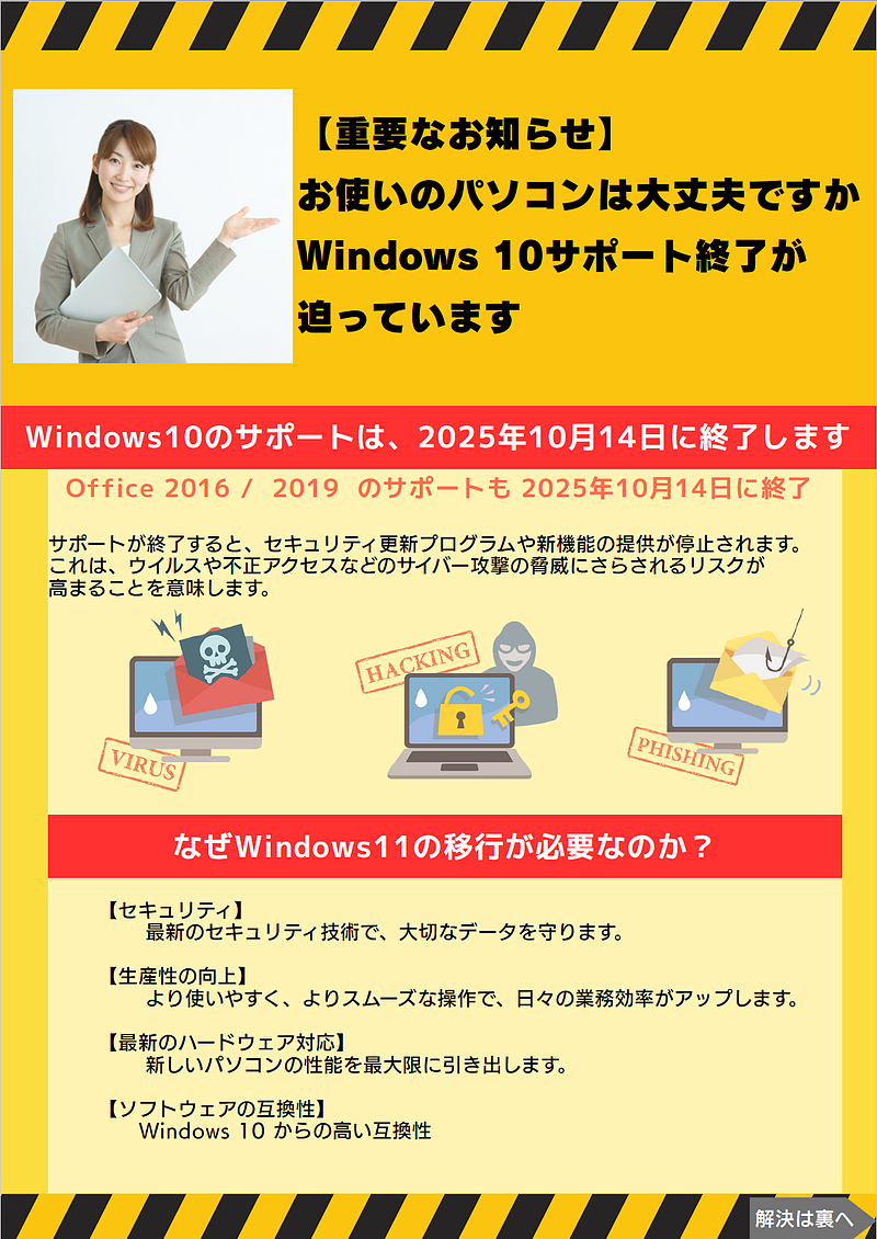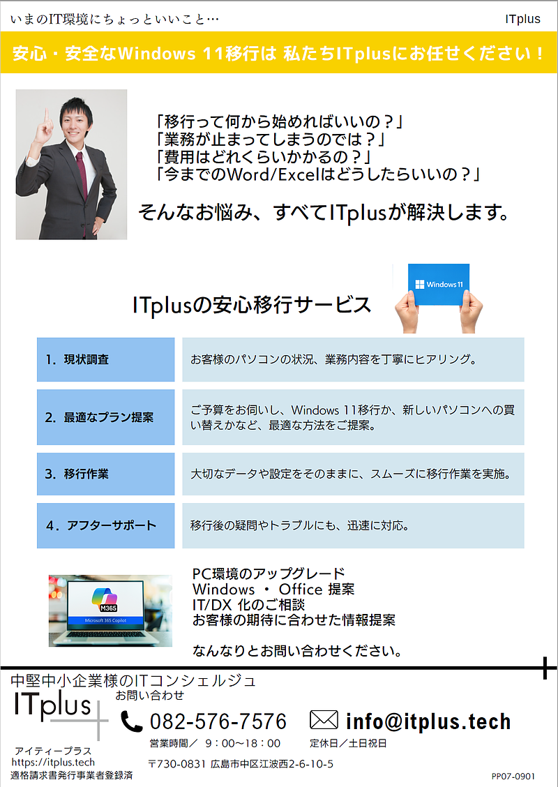 パソコンの買い替えやWindows 11への移行は、少し手間がかかるかもしれませんが、今後数年間を安心して過ごすための投資と考えましょう。