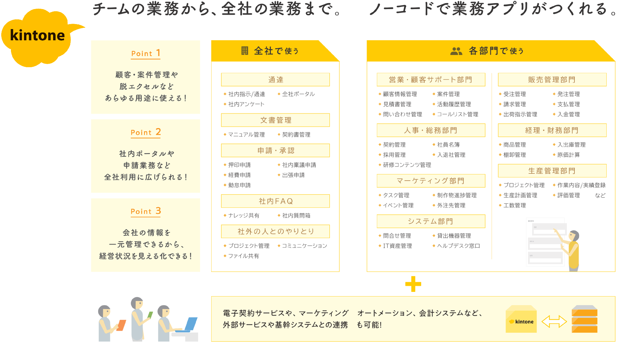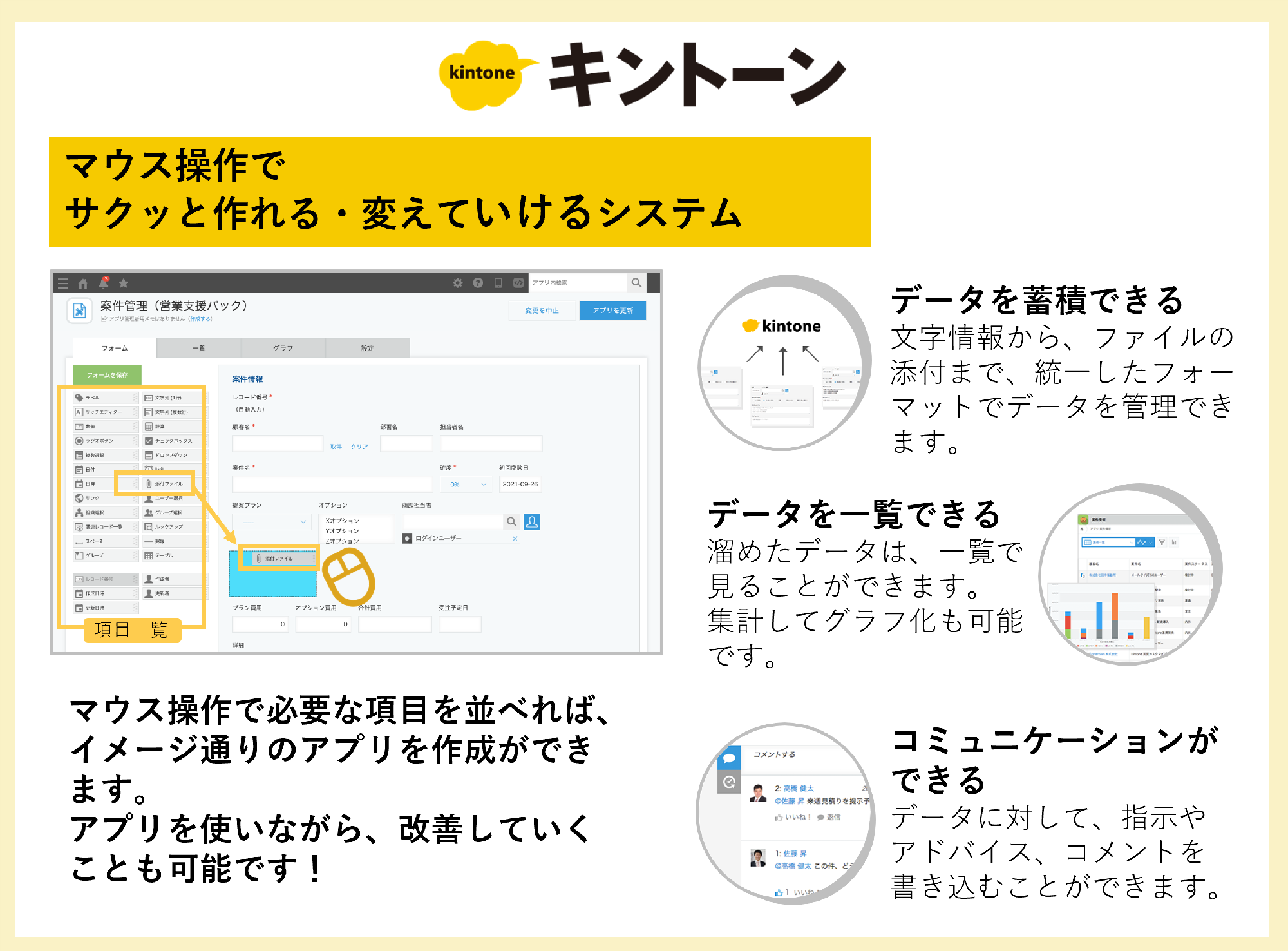 kintoneとは、開発の知識がなくてもあらゆる業務に合わせたシステムを簡単に作成できるサイボウズのクラウドサービスです。