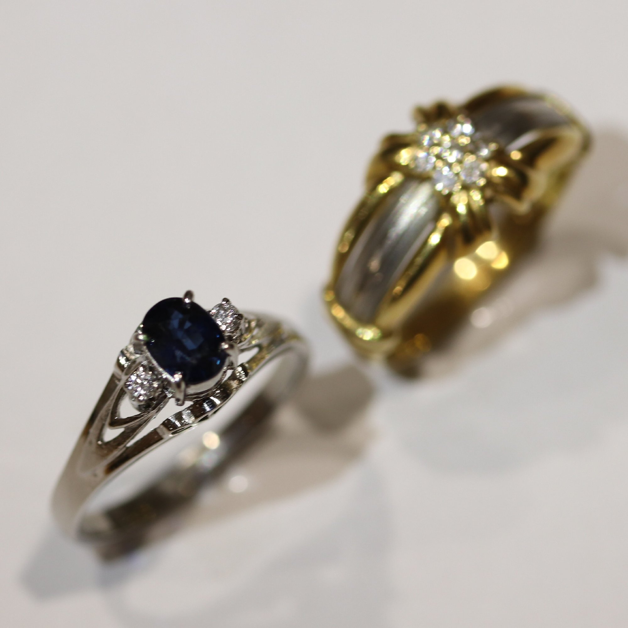 広島市安佐南区T様からご用命いただいたプラチナサファイヤリングと18金とプラチナコンビのダイヤリングを一つのプラチナサファイヤリングにジュエリーリフォームさせていただきました。