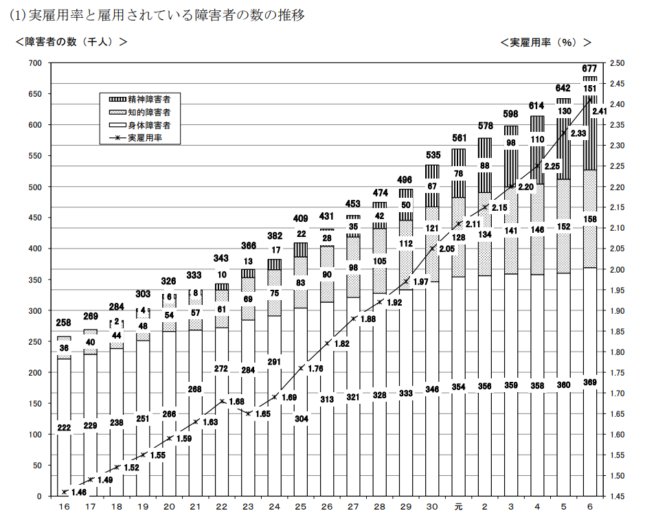 近年、障害者雇用の状況は着実に改善されてきています。令和6年のデータによると、日本全体で障害者雇用者数は677万人に達しており、障害者雇用率も年々上昇しています。企業においても障害者雇用の重要性が広まり、多くの障害者が社会で活躍できる環境が整いつつあります。