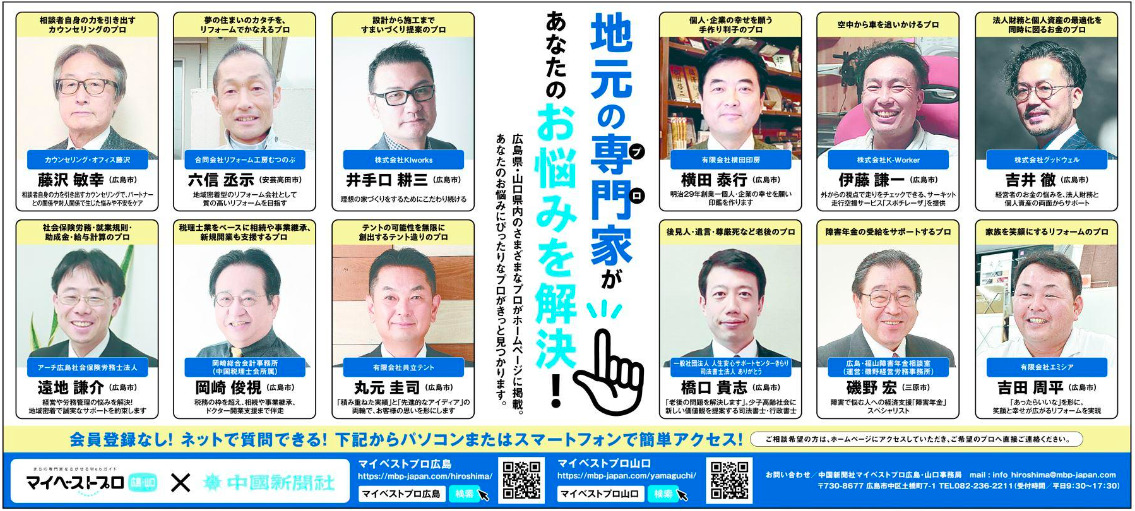 プロ12人を紹介する広告を2026年2月13日(金)付 中国新聞朝刊(32面・社会面)に掲載しています。是非ご覧ください。