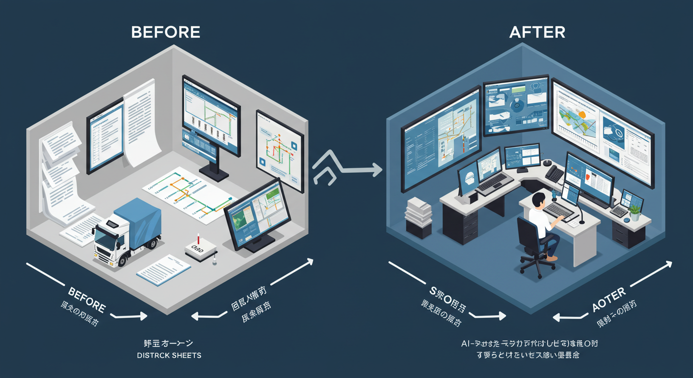 同社が最初に取り組んだのは、配車最適化システムの導入でした。クラウドベースのシステムを採用することで、場所を問わずアクセスが可能になり、スマートフォンでの現場対応も実現。AIによる最適ルート提案により、配車作業時間は4分の1に削減されました。