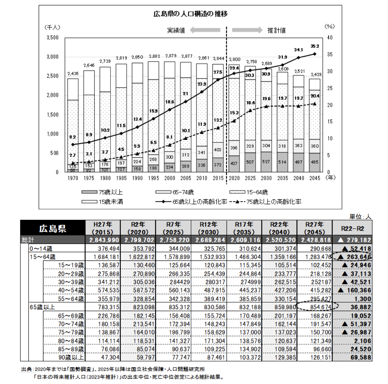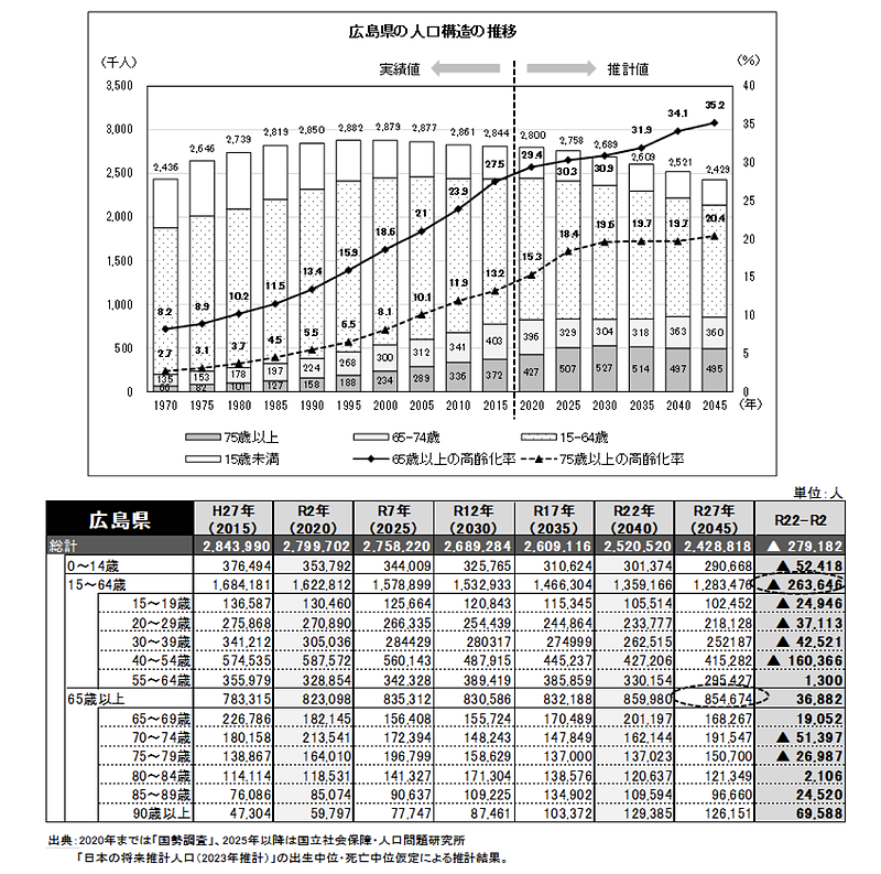 まず、広島県が公表している『第2期広島県地域福祉支援計画』の将来推計人口のデータをご覧ください。