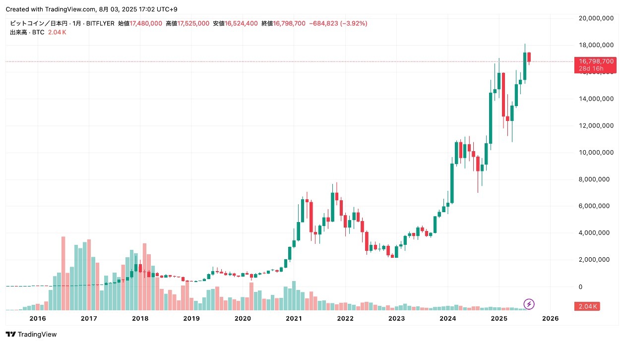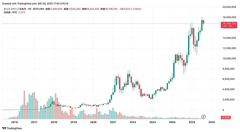 誕生から15年、価格は長期的には右肩上がり。2010年に1BTC=数円だったものが、2025年現在では1700万円台にまで成長しました。