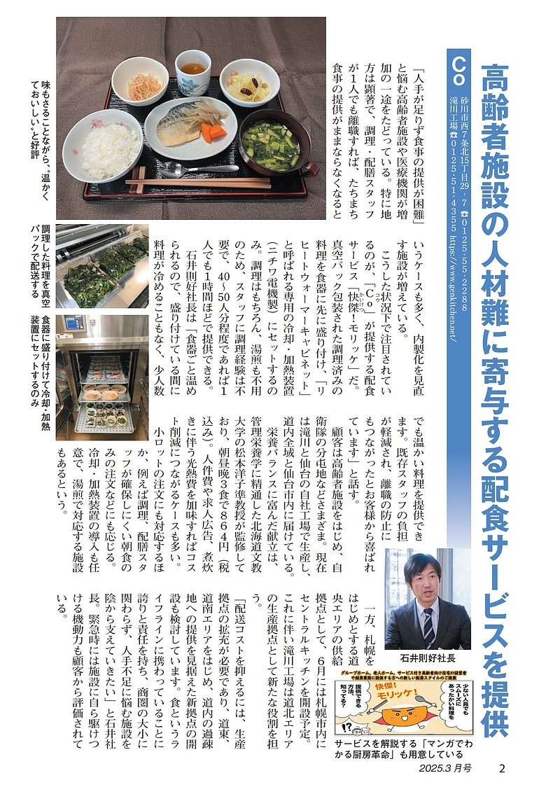 高齢者施設などで深刻化する厨房スタッフの人手不足を解消すべく、真空パック食材と専用調理器によるオペレーションシステムを開発。スタッフ1人で約50人分の食事を提供できる上、作りたてのような温かさも魅力。
