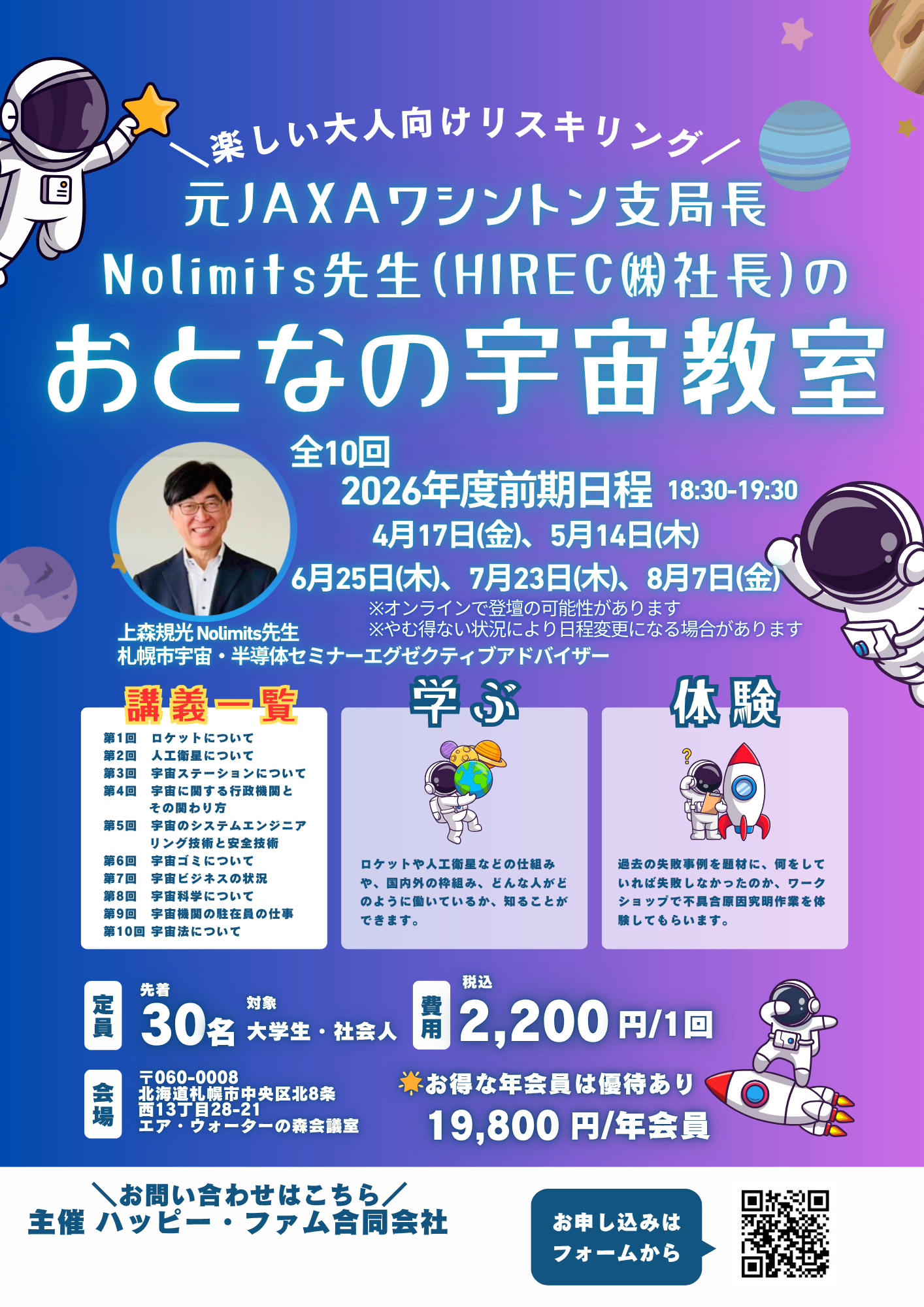 札幌市宇宙・半導体セミナー エグゼクティブアドバイザーも務める、元JAXAワシントン支局長の上森規光(Nolimits先生)による、全10回の本格的な宇宙講座です。